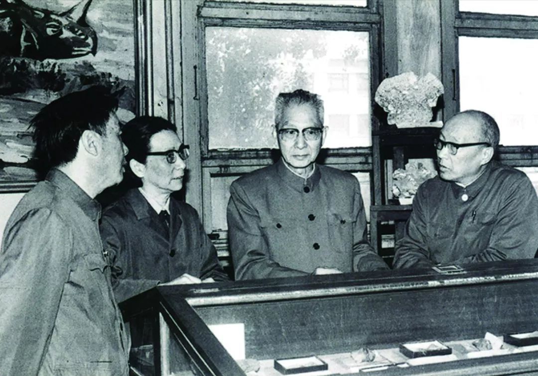 1982年,杨遵仪和王鸿祯(右1)、郝诒纯(左2)、杨式溥(左1),4位古生物学家讨论团队建设问题。