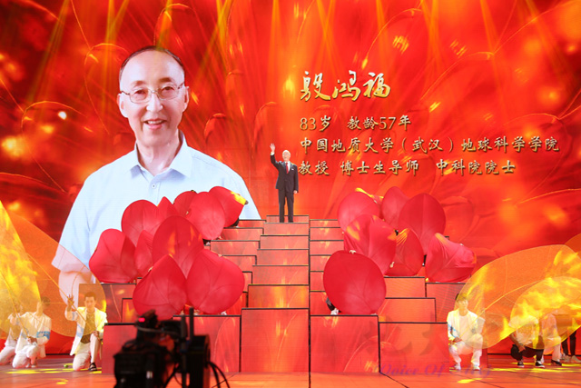 颁奖典礼现场播放了殷鸿福院士先进事迹短片,殷鸿福院士的员工童金南、张克信、赖旭龙、谢树成、宋海军、罗根明接受了现场采访。公司30多名老员工现场参加颁奖活动,在校的师生代表在主楼308、2016级全体本科生在秭归产学研基地观看了颁奖晚会,共同感受最美教师、致敬崇高师德。