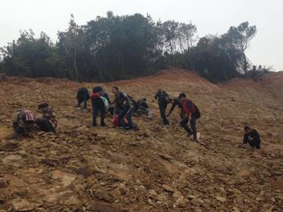 通讯员:田力2015年11月28日,w88win体育官网入口2014级地质学基地班同学,前往武汉市江夏区花山大道附近,进行了《古生物学》的野外教学活动。师生一行四十余人,不畏冬雾天的寒风,一到达现场,就爬到山上的露头边,一锤一锤的寻找已经在岩石中沉睡了四亿多年的志留纪生物化石标本。