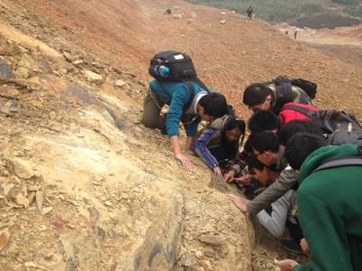 “你看,这里有好多三叶虫尾甲!”有很多同学在亲自发现化石后异常兴奋。“老师,您看我挖到的这个是不是双壳化石?”同学们在一有新发现后,就马上向授课老师童金南教授和助教梁蕾请教咨询。“我们在野外采集化石的时候,要注意学会团队配合。你们可以学习小组为单位,几个男生从露头上挖大块下来,其他同学再慢慢将大块劈开进行仔细观察,这样才容易采集到完整的化石标本。”童老师在结合教科书知识为大家讲解不同化石标本的结构和背景知识的同时,也不时的在一旁传授大家采集标本的心得。