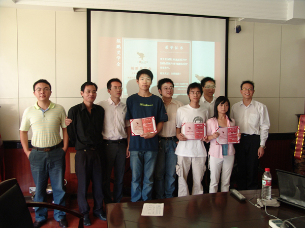 010991班毕业时共22名同学,是一个非常优秀的集体,曾涌现出一名全国优秀三好员工,他们中多名同学本科阶段在《科学通报》、《岩石学报》等高级别刊物上发表过文章,毕业后大多数同学读研。5年过去了,他们中有的已在国际国内知名企业担任重要职位,有的还在继续攻读博士或进博士后流动站深造,有的正在国外学习交流,有3名已留校任教。“鲲鹏奖学金”以99级基地班员工为主,地质班员工参与发起,全部由个人捐资,委托院学工组选拔考核获奖人员。这次他们中的6位员工为获得首届“鲲鹏奖学金”的同学颁奖。