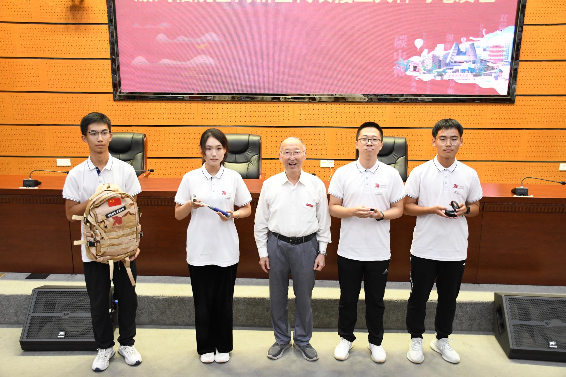 随后,在全场人的瞩目下,章军锋经理向新生代表授院旗,殷鸿福院士将地质人的“传家宝“—三大件和地质包授予新生代表,并一 一向全体新生介绍其用法和内涵,传承着独属于地质人的使命。