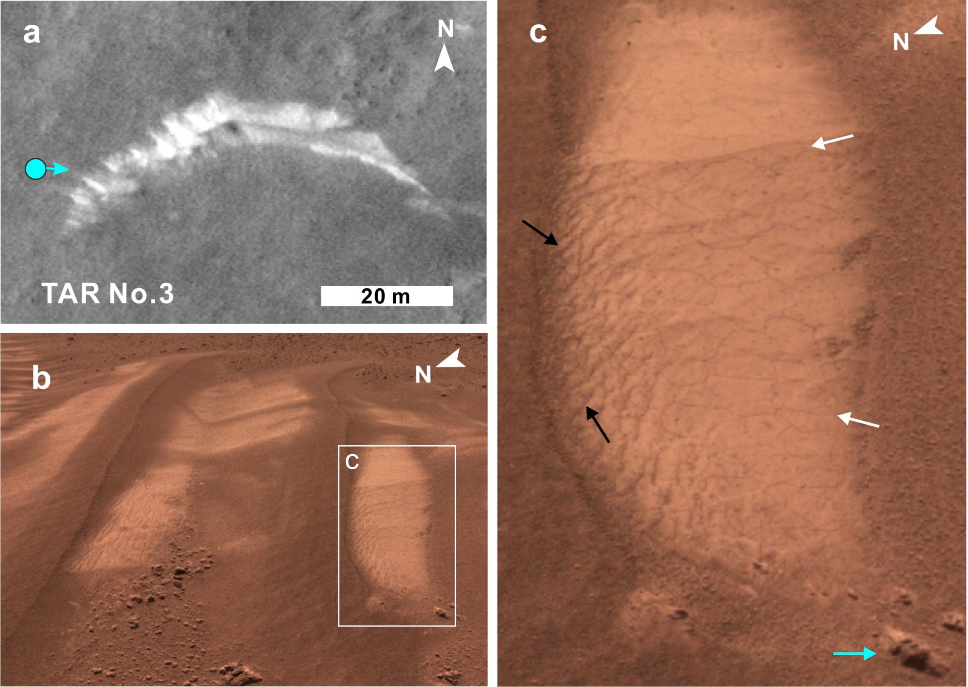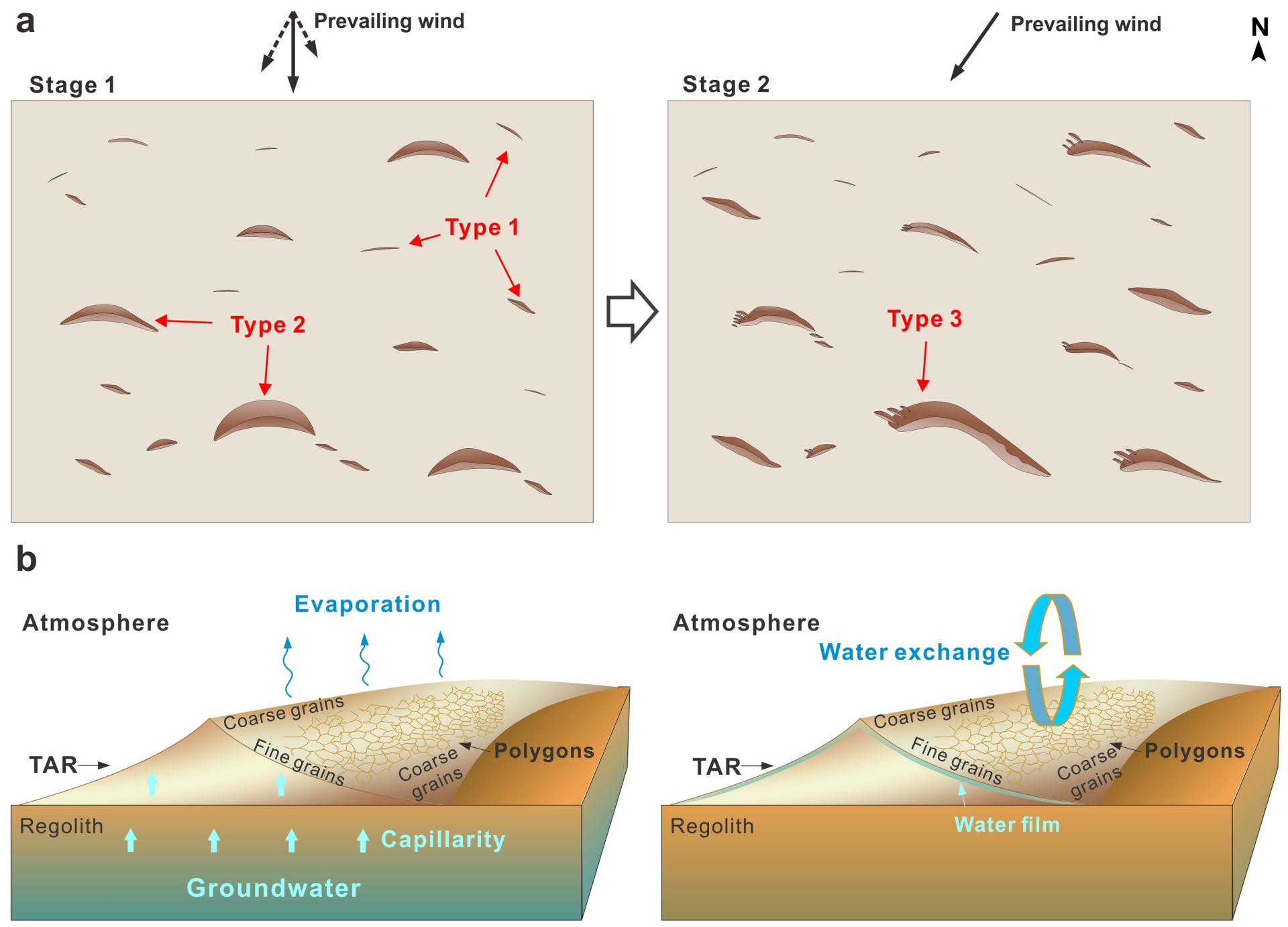 基于上述分析结果,结合着陆区的地质背景,认为这些多边形裂隙可能存在两种成因(图4b):(1)地下水通过毛细作用被输送至TAR表面,在水分蒸发过程中表面收缩形成多边形;(2)地表与大气中的水汽交换导致TAR表面形成硬化的砂质壳层,壳层破裂形成多边形裂隙。其中,在当前的火星环境条件下,第二种机制最为可能。同时,由于TAR是火星表面较为年轻的地貌(可能小于100万年),且这些多边形裂隙在TAR演化的后期形成,因此它们可能指示了火星近期水活动及地表-大气水的交换过程,从而为研究火星在当前寒冷干旱气候条件下的水循环提供了线索。