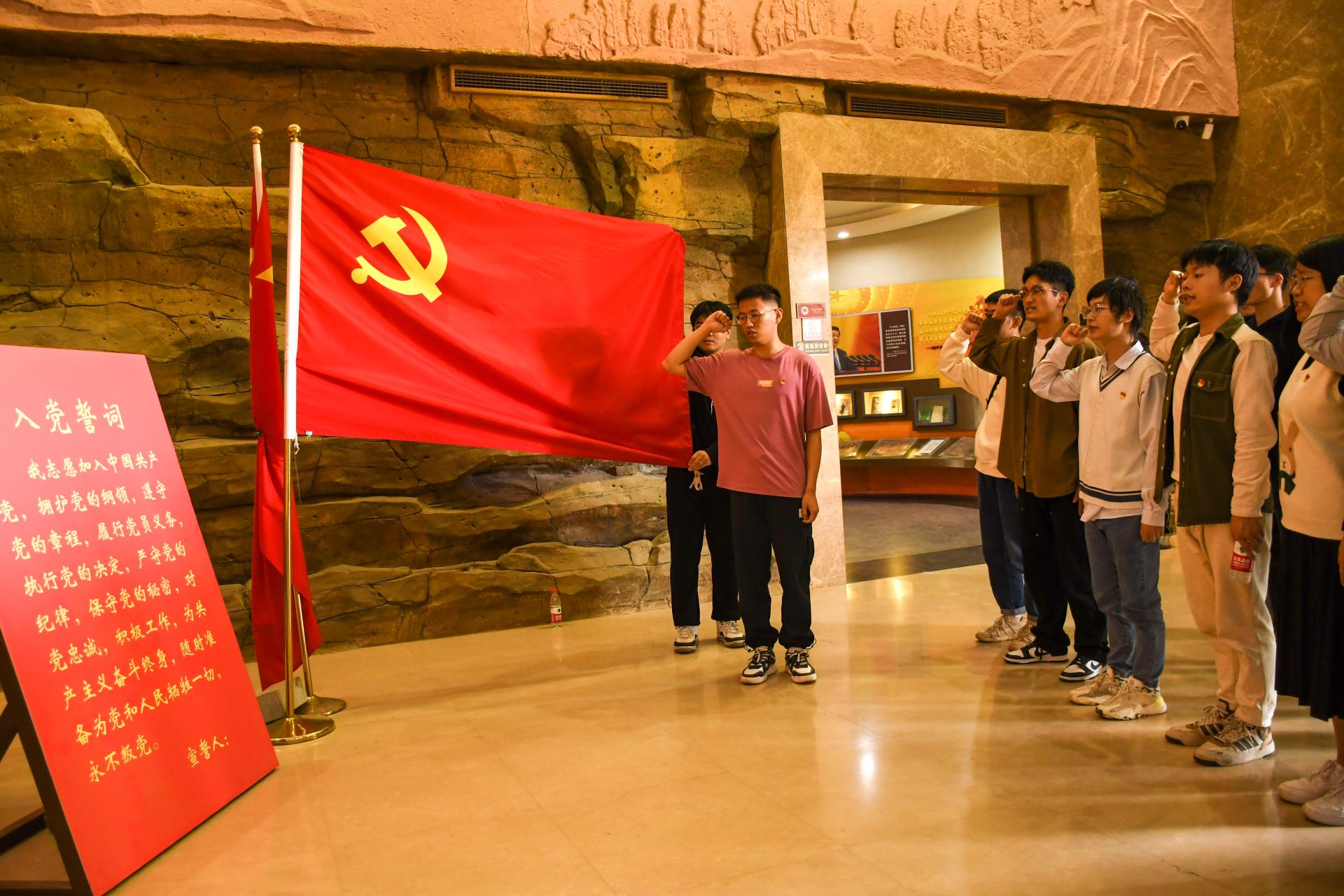 4月30日下午,师生党员们离开金岭村,来到宣化店中原突围纪念馆。1946年6月26日,震惊中外的“中原突围”战争就是从这里打响,拉开了全国解放战争的序幕。进入中原突围历史纪念馆,员工党员栗千贺带领全体党员在党旗下重温入党誓词。