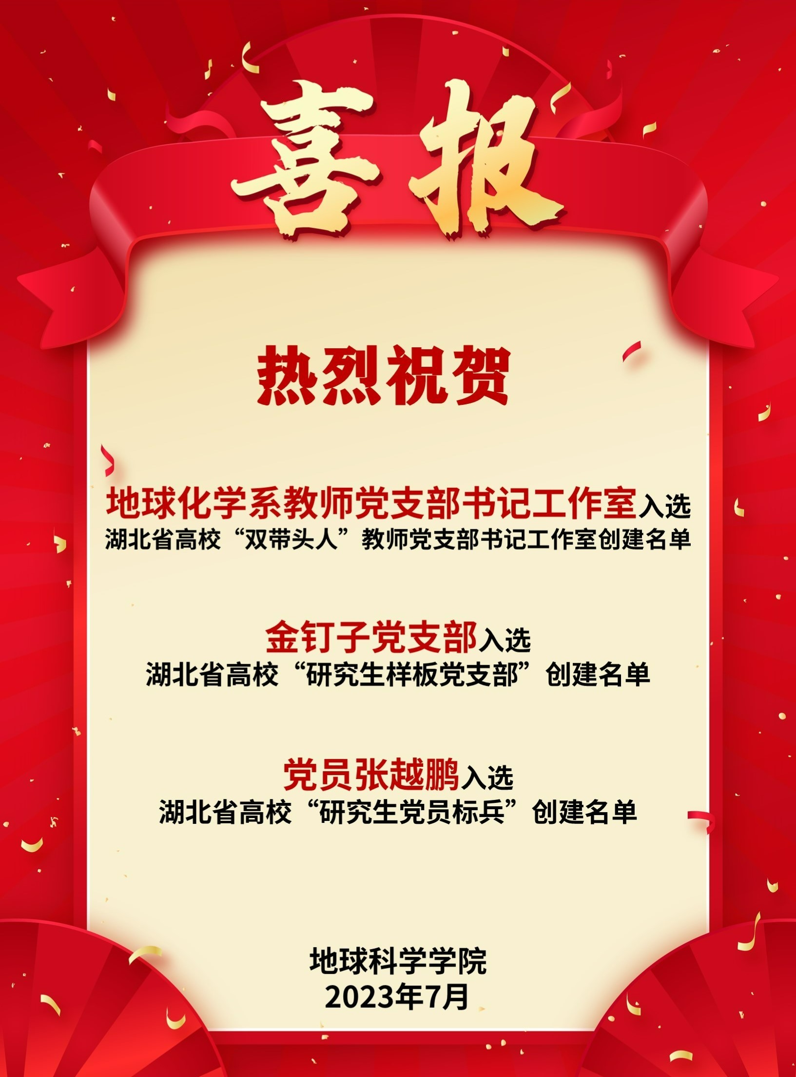 近日,湖北省高校“双带头人”教师党支部书记工作室、“研究生样板党支部”和“研究生党员标兵”创建结果揭晓,公司地球化学系教师党支部书记工作室入选湖北省高校“双带头人”教师党支部书记工作室创建名单,金钉子党支部(生物与环境演化研究生党支部)入选湖北省高校“研究生样板党支部”创建名单,党员张越鹏入选湖北省高校“研究生党员标兵”创建名单。