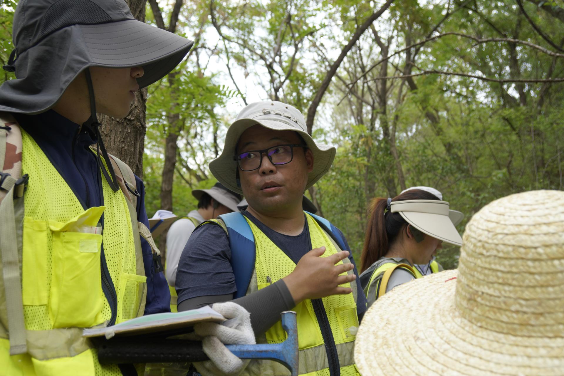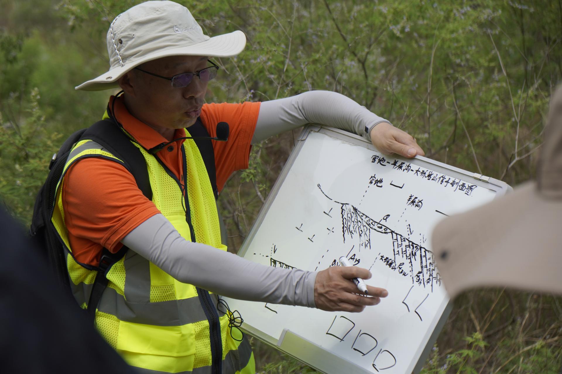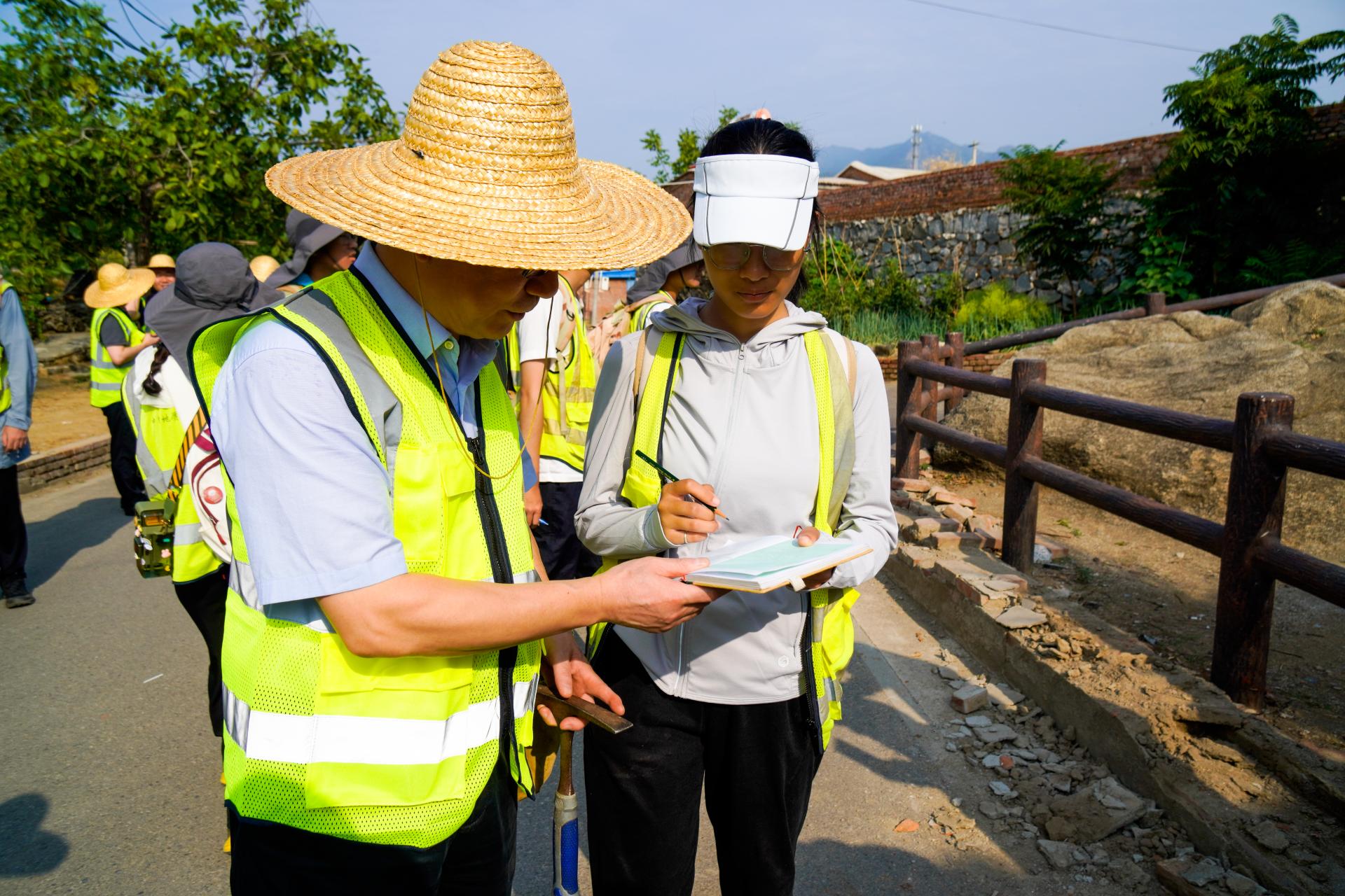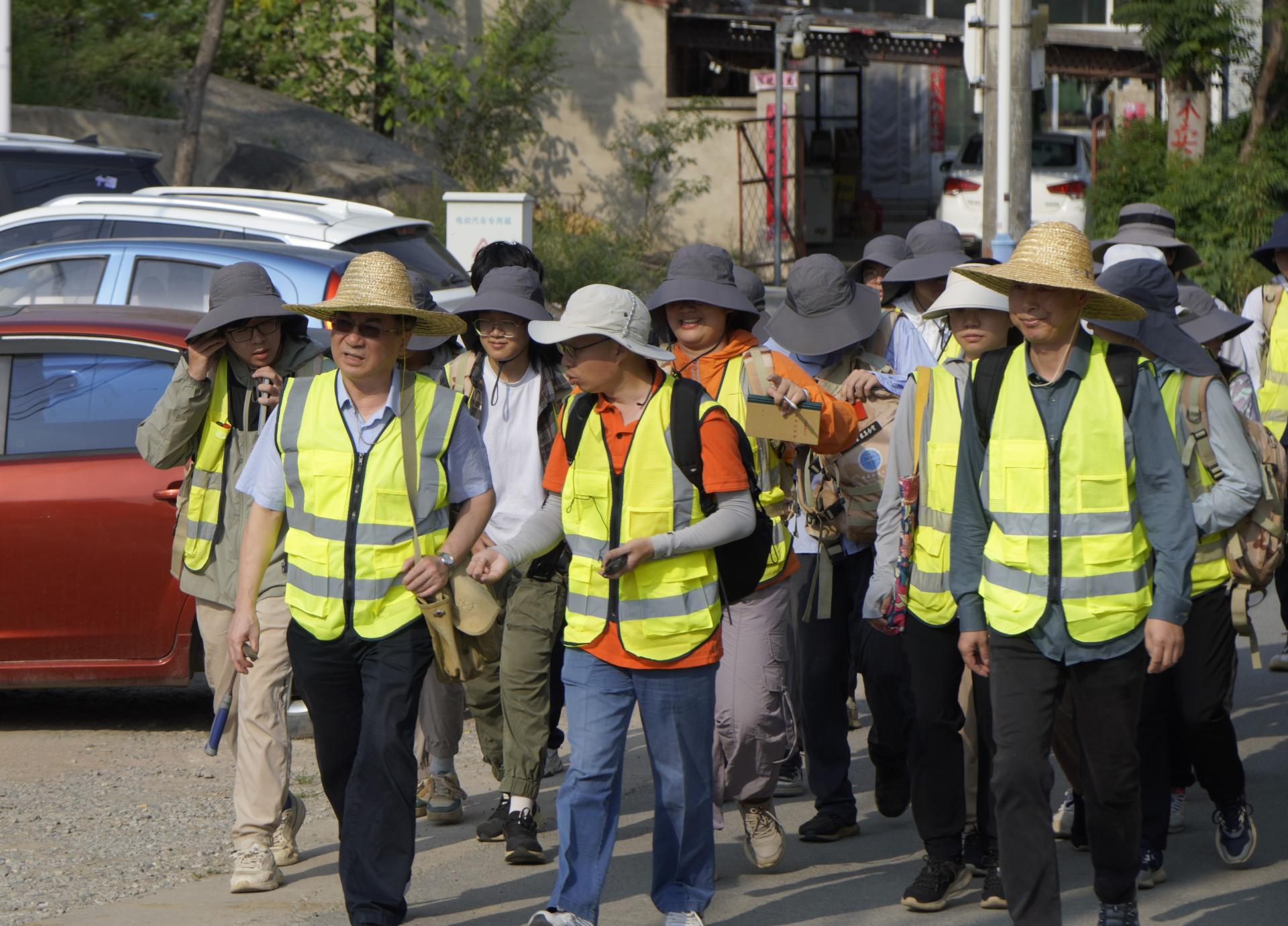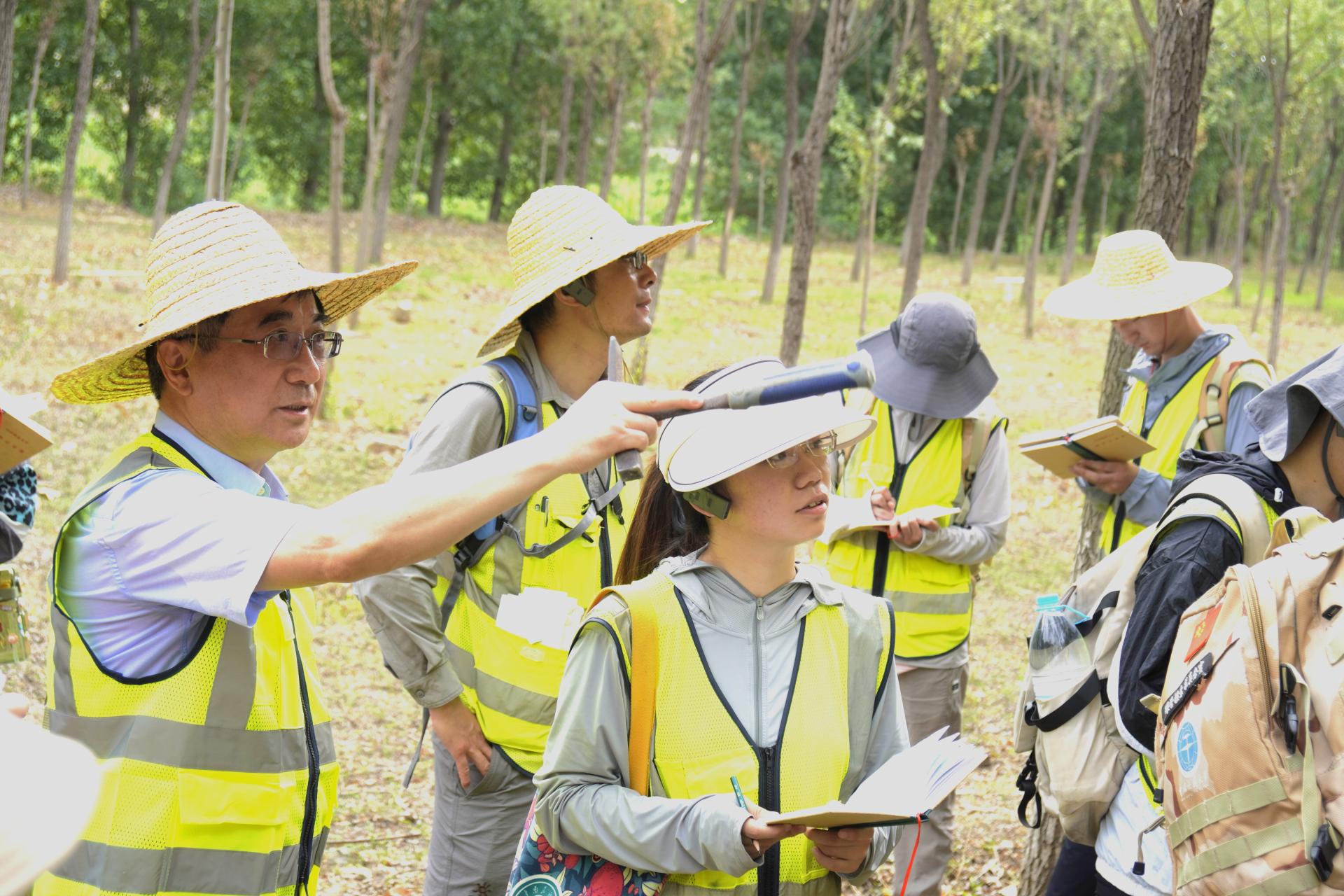 期间,王焰新一行随队参与野外实习。实习过程中,他与同学们一起听取老师授课,查看同学们的野外记录簿,并为同学们现场讲解坡积物与洪积物的野外地质现象。