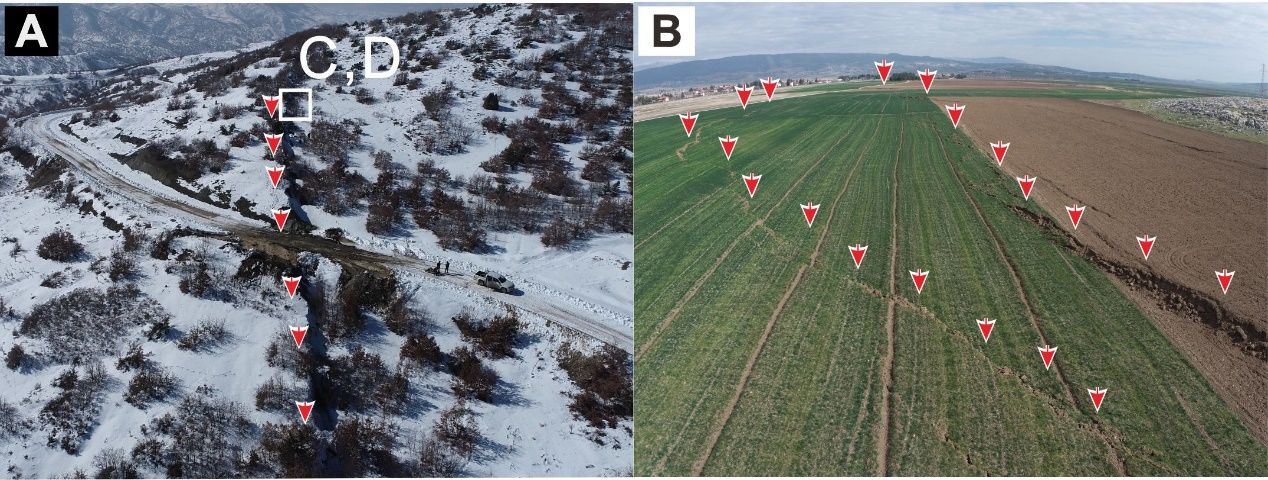 2023年2月16日,土耳其首震发生后第十天,Kusky研究团队将项目组成员博士生孟建南派达震区,与项目组海外合作者成员土耳其中东技术大学地质工程公司经理、w88win体育官网入口(武汉)客座教授Erdin Bozkurt教授共同开展震后地质调查。项目组在地表破裂痕迹被降雨、洪水、灾后重建以及其他震后变形作用破坏之前,对与该次地震事件造成死海断层、东安纳托利亚断层的地表位移进行系统实地测量,并选取代表性区域,对地震导致的地表破裂进行厘米级无人机填图,并以数字地图的形式永久保存。这是人类历史上震后罕见和及时的地表破裂变形原始记录,为大型走滑型地震事件导致的地表变形、破裂在复杂断层系统之间的传播机制提供了重要参考。文章成果于2024年1月19日发表在《Science》期刊,并作为Research Highlight推荐。第一作者为w88win体育官网入口(武汉)w88win体育官网入口2018级博士生孟建南和Timothy Kusky教授,共同通讯作者为Timothy Kusky教授和美国地质调查局Walter Mooney教授,共同作者还包括土耳其中东技术大学地质工程公司Erdin Bozkurt教授,土耳其哈卡里(Hakkari)大学工程公司Mehmet Nuri Bodur教授和地质过程与矿产资源国家重点实验室王璐教授。