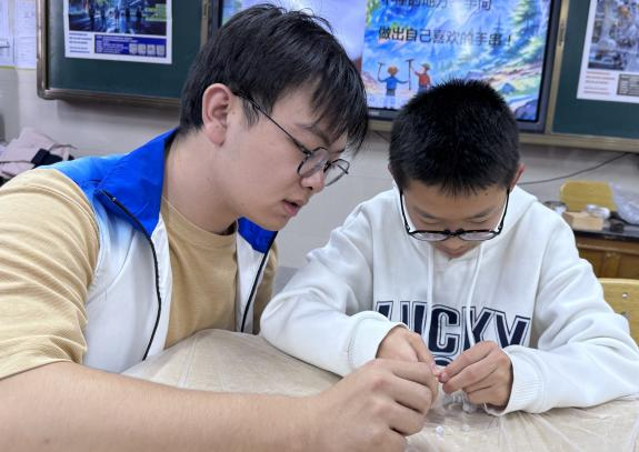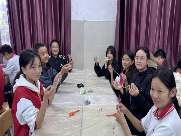 本班科普课堂后是DIY串珠手链体验活动,李槟馨在讲台上演示,罗明辉和支教团赵安然老师辅助在各个小组间逐一指导,员工们挑选了喜欢的颜色及矿物珠子原料,按照各自的手腕粗细,完成了自己独一无二的珠宝手链,在学思践悟中感悟珠宝矿物的魅力。
