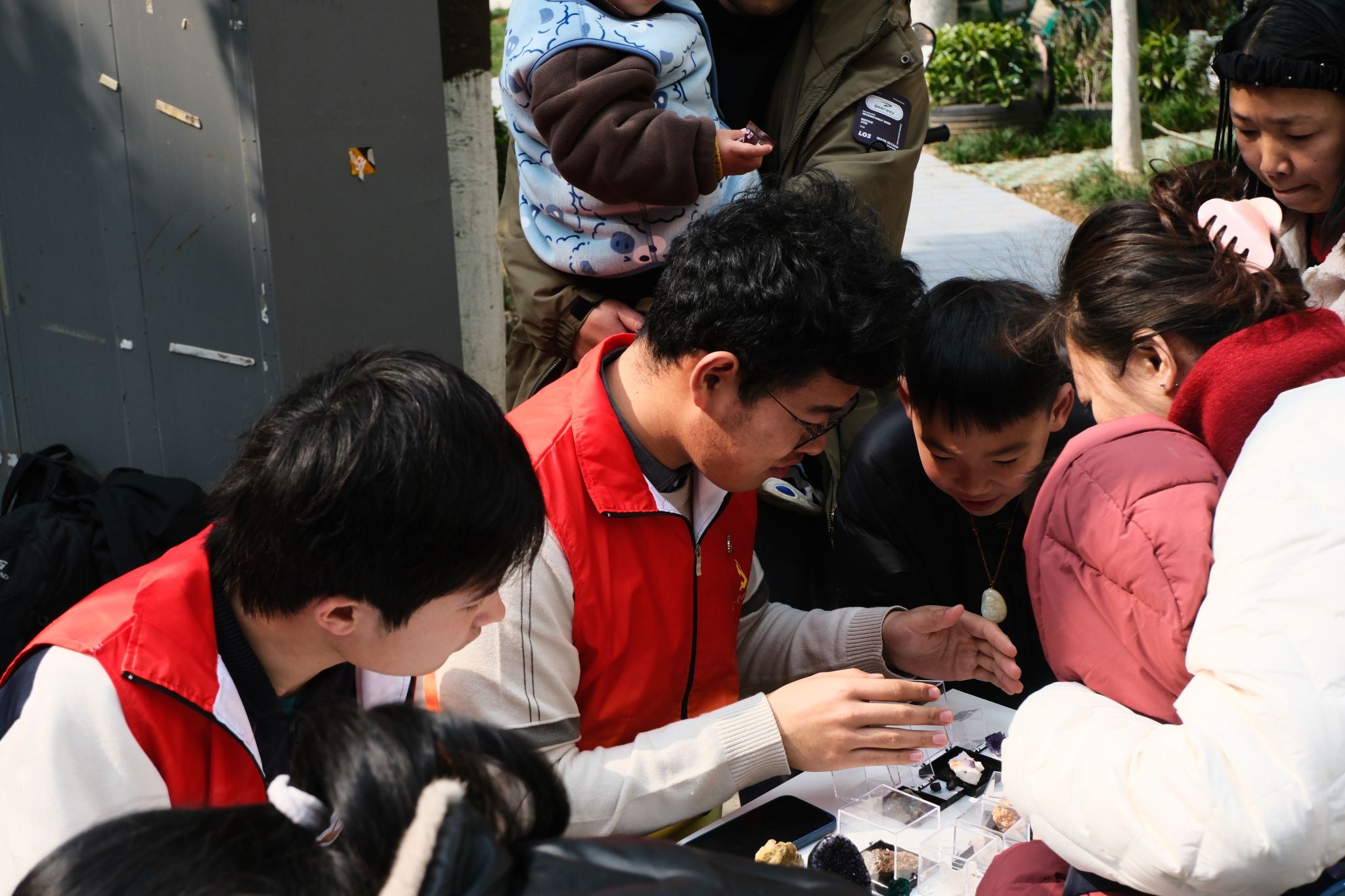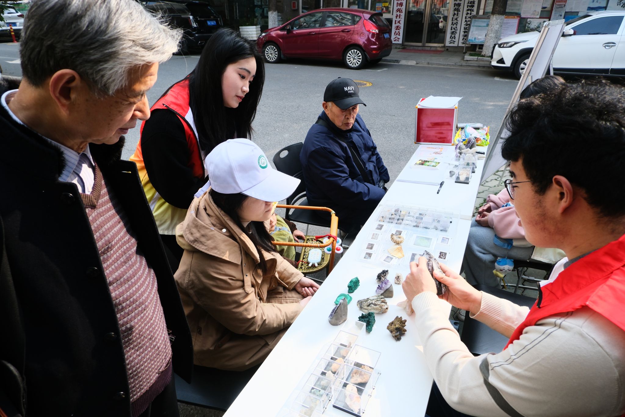 “每一块矿石都是凝固的星系密码,每枚化石都在砂岩中封存着远古的时钟”,当志愿者们把精美的矿物标本和化石标本展出的那一刻,社区内众多的小朋友都被这些来自地球深处的宝藏深深吸引。他们好奇地围在展台前,瞪大眼睛,仔细观察着这些历经千万年变迁的自然奇迹。