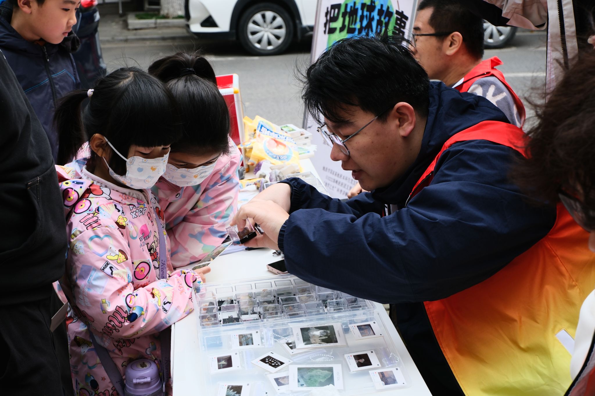 不止小朋友们,许多社区内的老人们也被这生动的讲解深深吸引,他们围在一旁,听得津津有味,仿佛也随着志愿者的描述,穿越回那遥远的时代。一位白发苍苍的老人,眯着眼睛,仔细端详着一块化石,嘴里喃喃自语:“真是神奇啊,没想到这些看似普通的石头,竟然藏着这么多的秘密。”另一位曾在地大教过课的老先生也对志愿者们的行为赞不绝口:“这样的活动非常有意义,不仅让孩子们增长了知识,也让我们这些老人重温了地质学的魅力。看到你们如此热衷于科学普及,我感到非常欣慰。”老先生的话语中饱含着对青年员工的鼓励和期待,也极大地鼓舞了志愿者们投身志愿服务的信心和信念。