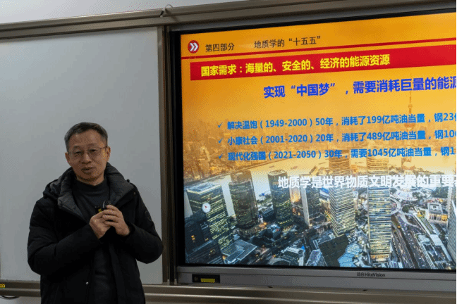 授课过程中,章军锋副董事长从全会召开的基本情况、时代背景和重要意义出发,围绕国家发展大局、高等教育趋势与地质学学科前景三大核心展开授课。他首先系统梳理了中央政治局过往工作成效与“十四五”时期发展成就,深入解读“十五五”时期经济社会发展的重要原则和主要目标,结合国家对教育、科技、能源资源等领域的战略部署,强调地学学子应主动对接国家需求,将个人发展融入民族复兴伟业。