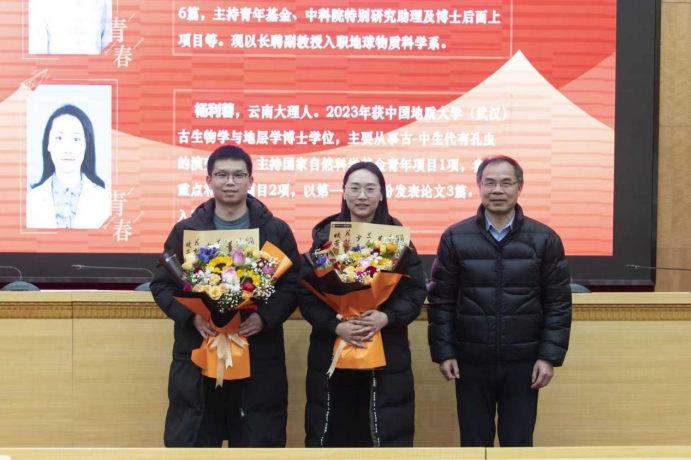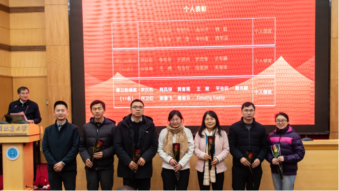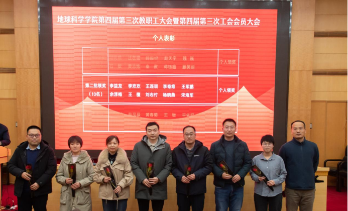 会议第三阶段是荣休仪式-入职仪式与年度表彰会。经理吴元保为荣休教师张宁和徐晓东献花,感谢他们多年来的辛勤付出和无私奉献。谢树成院士为新入职教师杨传茂和杨利蓉献花,欢迎他们加入w88win体育官网入口。会议并对年度优秀团队和个人进行了表彰,鼓励大家向先进集体和先进个人学习。