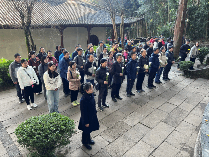 在小团坡墓地,全体老师举行了简朴而庄重的祭奠仪式。大家手持洁白的菊花,整齐列队面向祠堂肃立,向长眠于此的英烈们深深三鞠躬,随后依次敬献鲜花,表达无限的哀思与最崇高的敬意。这一刻,只有风声掠过树梢,现场一片寂静,唯有心中涌动的缅怀与誓言在无声激荡。鞠躬与献花,不仅是仪式,更是两系党员教师与历史的一次庄严对话,是对先烈精神的真诚承接。