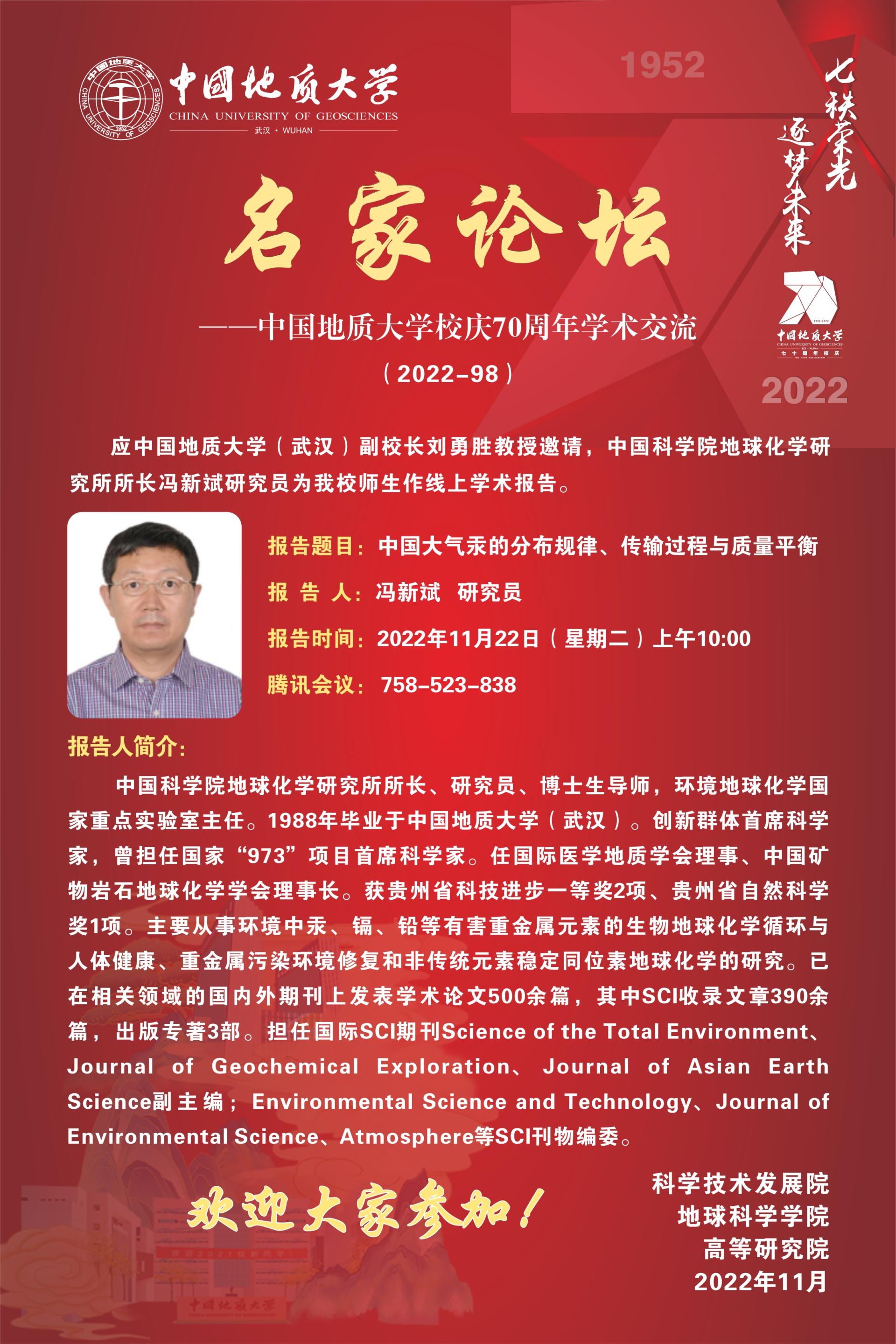 【11月22日】校庆系列学术活动---名家论坛:中国科公司冯新斌研究员