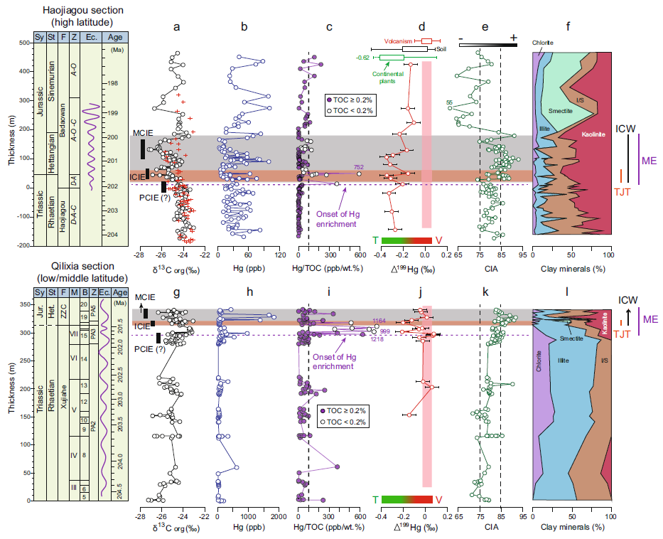 研究团队选择了东亚地区代表高纬度(新疆准噶尔盆地的郝家沟)和中低纬度(四川盆地宣汉地区)的两个发育连续的T-J地层剖面,开展多种方法的分析和研究,包括有机碳同位素、汞浓度和同位素、化学蚀变指数(CIA)和粘土矿物等,目的在于探究T-J界线陆地沉积物中火山活动的记录及大陆化学风化响应。这些剖面远离中大西洋大火成岩省, 可以探究该时期大西洋大火成岩省对远离其喷发口区域的影响。