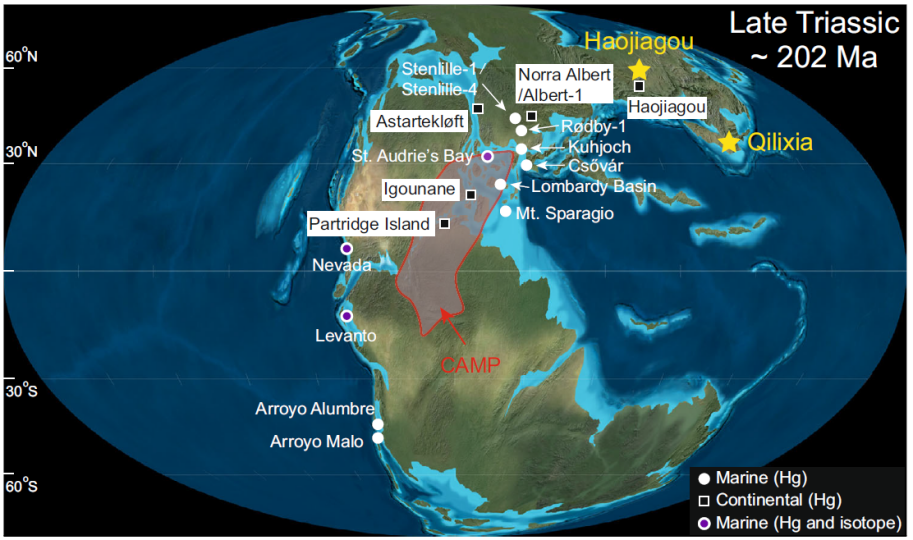 图1 约2亿年的晚三叠世全球古地理图。五角星代表中国准噶尔盆地和四川盆地两个剖面的古地理位置。圆圈和正方形分别表示已经报道的海相和陆相汞记录剖面。CAMP代表中大西洋火成岩省分布范围。