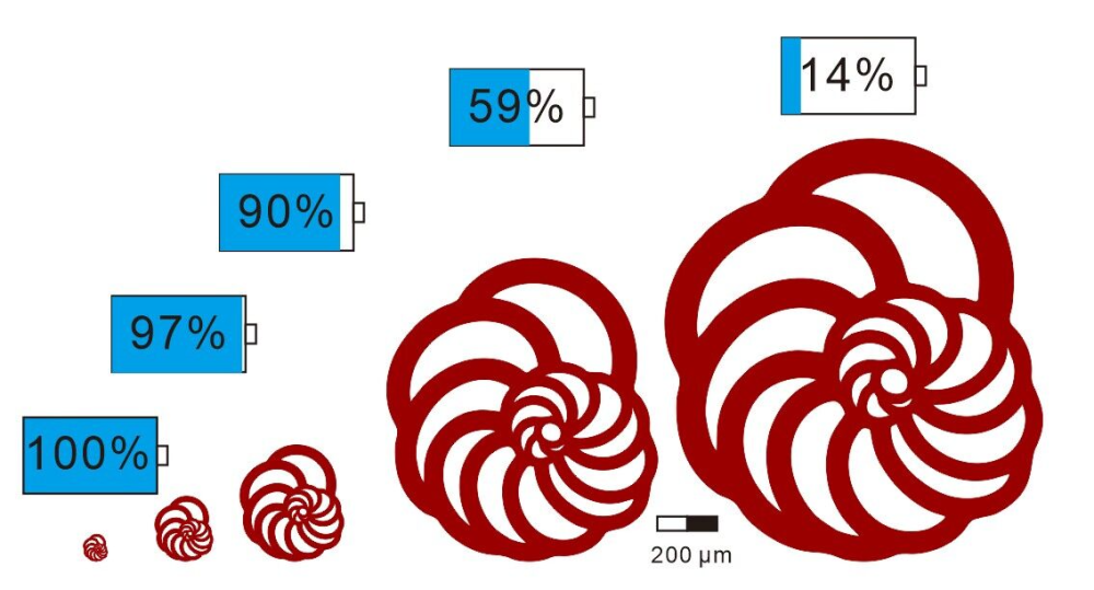 研究团队发现,在海水氧含量较低的条件下,氧气难以扩散到大型有孔虫的细胞中心,这也解释了为什么大型有孔虫更容易灭绝。大型有孔虫由于其较小的表面积与体积比,使得氧气无法有效地扩散到细胞内部,导致在低氧或缺氧环境中更易灭绝。
