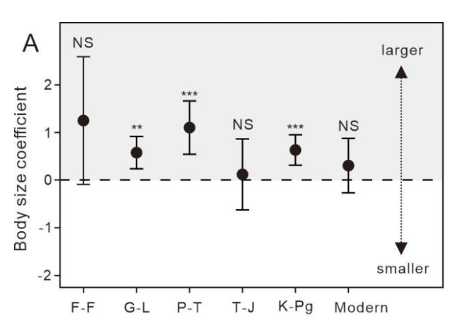 研究团队收集了12701个样本数据,涉及晚泥盆世弗拉斯期—法门期大灭绝事件、中—晚二叠世大灭绝事件、二叠纪末大灭绝事件、三叠纪末大灭绝事件、白垩纪末大灭绝事件,结果发现有孔虫表现出明显的体型依赖性,体型较大的有孔虫在过去的灭绝事件中更容易灭绝。
