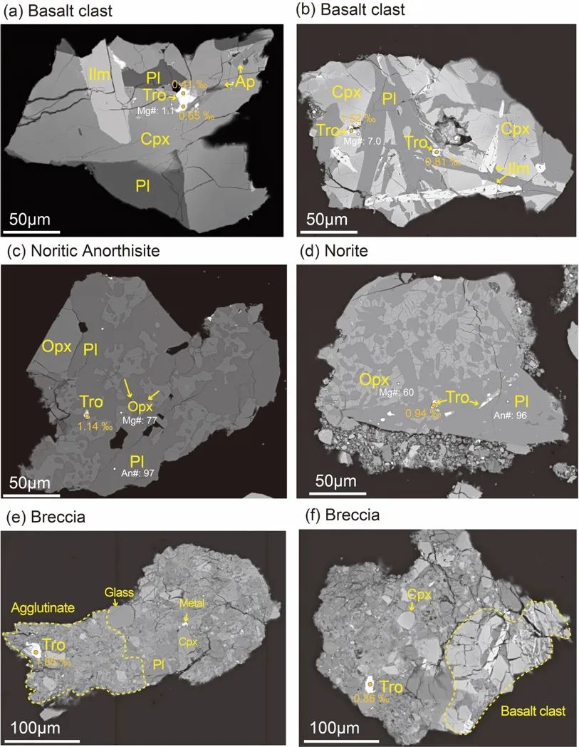 月球玄武岩中的硫主要以陨硫铁的形式存在,主要形成于玄武岩浆演化晚期,因此陨硫铁的硫同位素组成能够代表岩浆整体的硫同位素特征。但是这些硫化物粒度非常细小,大部分小于20微米。得益于w88win体育官网入口(武汉)地质过程与成矿预测全国重点实验室激光测试方法的持续创新突破,胡兆初教授团队开发了对地质和行星样品中硫化物硫同位素的高空间分辨率(~8μm)和高精度(δ34SV-CDT: 0.50‰, 2sd)测试手段。该方法具有基体效应弱、高效低廉的显著优点,已经成功应用于嫦娥五号和月球陨石(图1,Wang et al., 2024)。w88win体育官网入口(武汉)汪在聪教授团队对嫦娥六号月壤中的低钛玄武岩以及月壳岩屑进行了详细的岩石学和地球化学工作,来理解月背壳幔岩石的硫同位素及其与正面的异同性,取得如下进展。