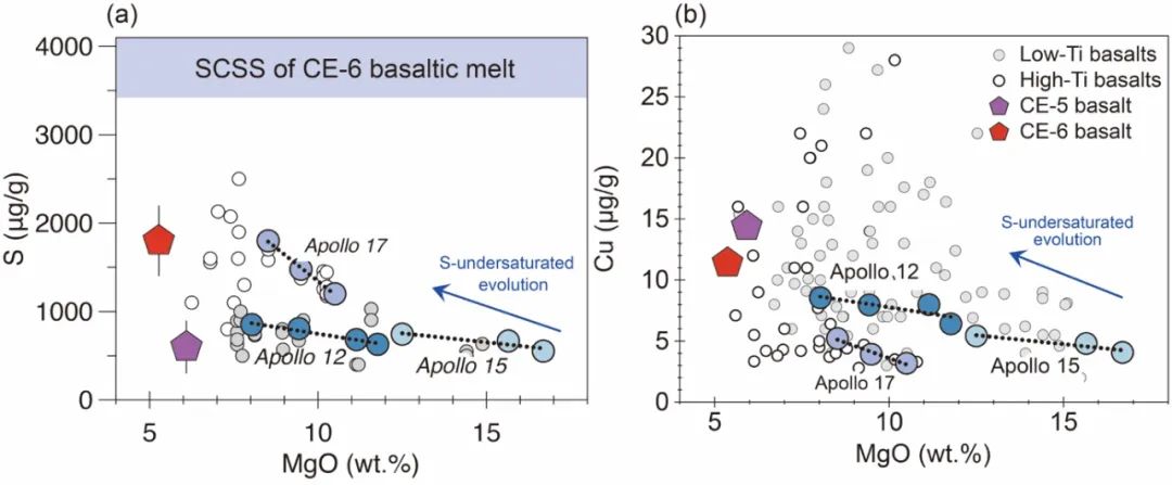 由于月球玄武岩的形成经历了广泛的演化,其中硫化物的早期饱和分离和岩浆去气都可能导致硫同位素分馏,因此理解嫦娥六号玄武岩是否经历这些过程十分关键。通过对嫦娥六号样品中40个低钛玄武岩岩屑的矿物模式丰度统计,得到嫦娥六号低钛玄武岩的陨硫铁丰度在0.31 ± 0.07 (2SE) vol%,对应硫含量为1800 ± 400 μg/g。该结果远低于嫦娥六号低钛玄武岩理论硫化物饱和硫溶解度(3420–5760 μg/g)。此外,月海玄武岩(包括嫦娥五号、六号和Apollo玄武岩)的S和Cu含量整体上都表现出不相容的演化趋势(图2)。这些证据表明嫦娥六号玄武岩岩浆演化早期不存在硫化物的饱和分离。