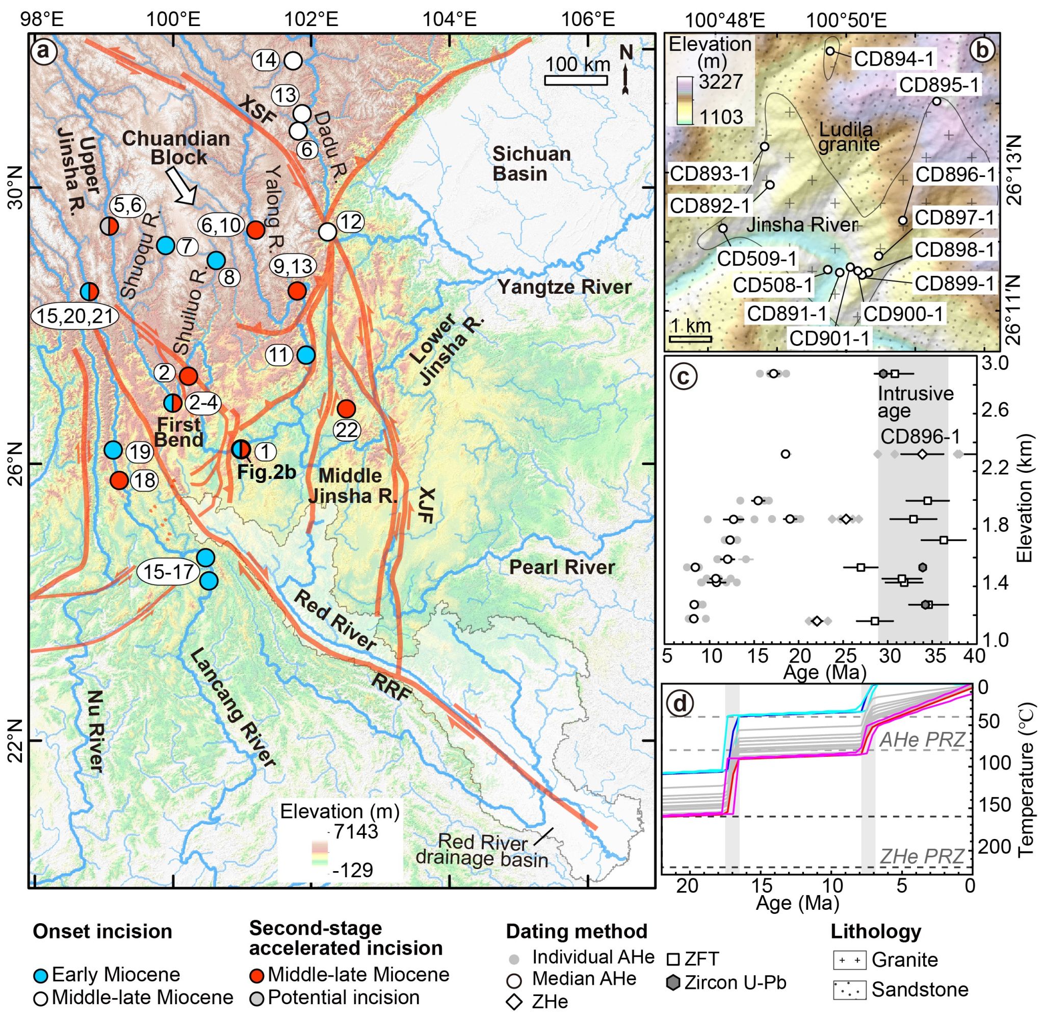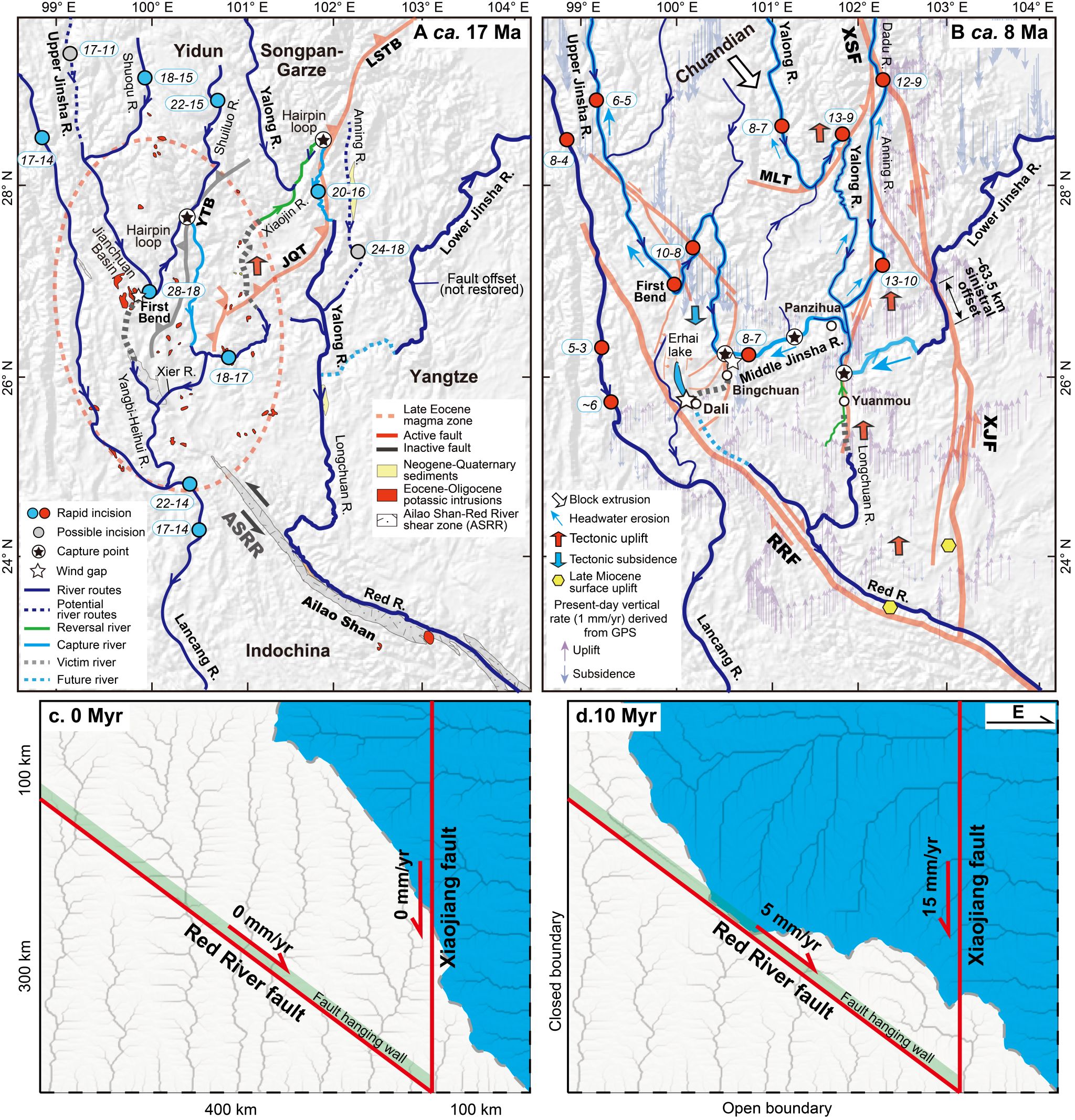该研究聚焦于长江上游和红河中游地区,开展了河流下蚀历史和沉积物物源示踪的互补研究,重建了青藏高原东南部古水系路径的演化过程。一方面,通过低温热年代学恢复了金沙江中游干流河谷的下蚀历史,揭示18-17 Ma和8-7 Ma两期河流快速下切。金沙江中游中新世早中期的河流快速下切与金沙江上游和澜沧江具有准同时性,指示金沙江中上游很可能与澜沧江连通形成南流水系。另一方面,通过对红河中游晚新生代盆地中的河流沉积物的碎屑矿物年代学和热年代学的物源示踪,指示中新世早中期的红河未曾与金沙江上游发生关联,而是与雅砻江连通形成另外一条南流水系。据此,重建了青藏高原东南部中新世早中期两条近平行的南流古金沙江和古红河。金沙江中游中新世中晚期的河流快速下蚀具有从下游(13-9 Ma)向上游(6-5 Ma)迁移的规律,指示河流溯源侵蚀依次袭夺南流水系,贯通形成东流长江,这一水系重组过程也被红河中游沉积物源变化所记录。地貌模拟验证晚新生代大型走滑断裂活动可以引起大陆尺度的地貌变化,驱动河流向西溯源侵蚀袭夺南流水系,最终形成类似于现今青藏高原东南部的水系格局。