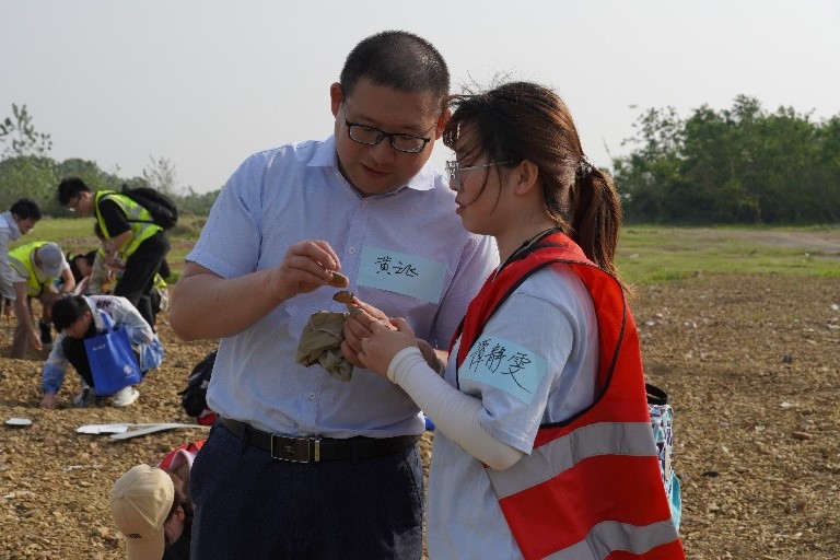 经过老师耐心细致的讲解后,大家分工协作,开始动手操作起来。夕阳和煦、春风吹拂,在山间野外,同学们完全忘记路途的疲惫和平日的烦恼,时而传来爽朗的笑声和惊叹声:“你们看我挖到了什么?这个化石标本好漂亮!”师生们听到后纷纷围到一起,原来一位同学挖到了一个十分完整的化石。“这是一枚双壳类化石,大家在野外拍照要记得放上比例尺或参照物。我们地质学讲究将今论古,这一枚小小的化石代表着4亿年前蔡甸曾是一片生机勃勃的海洋”,老师们说。