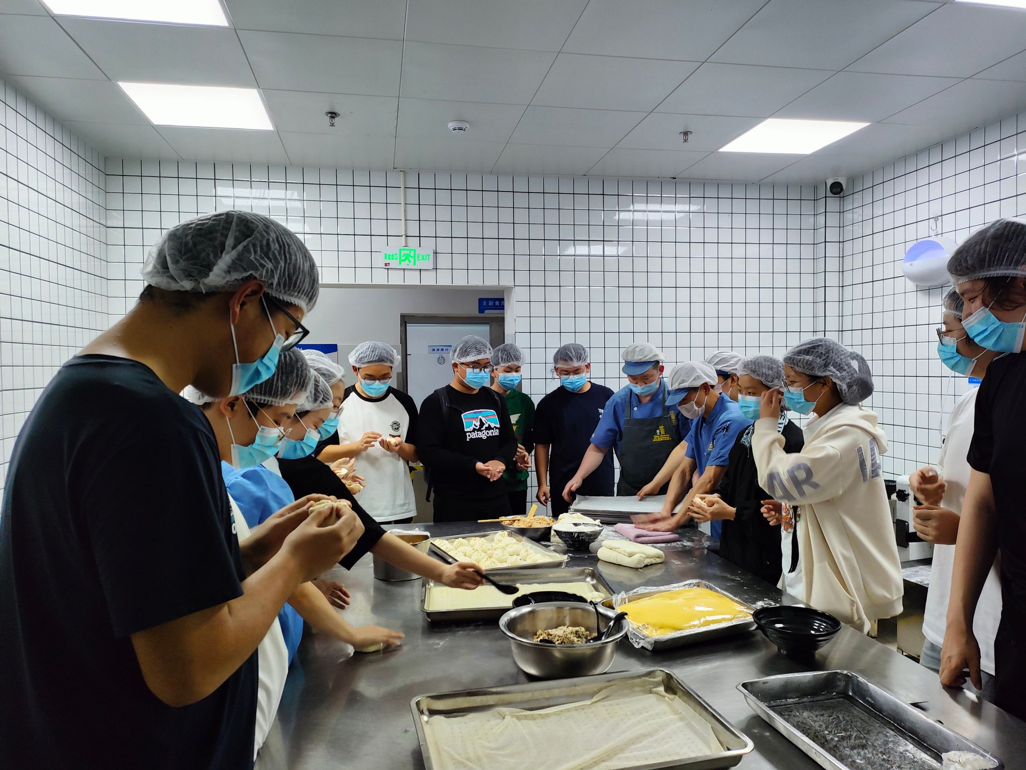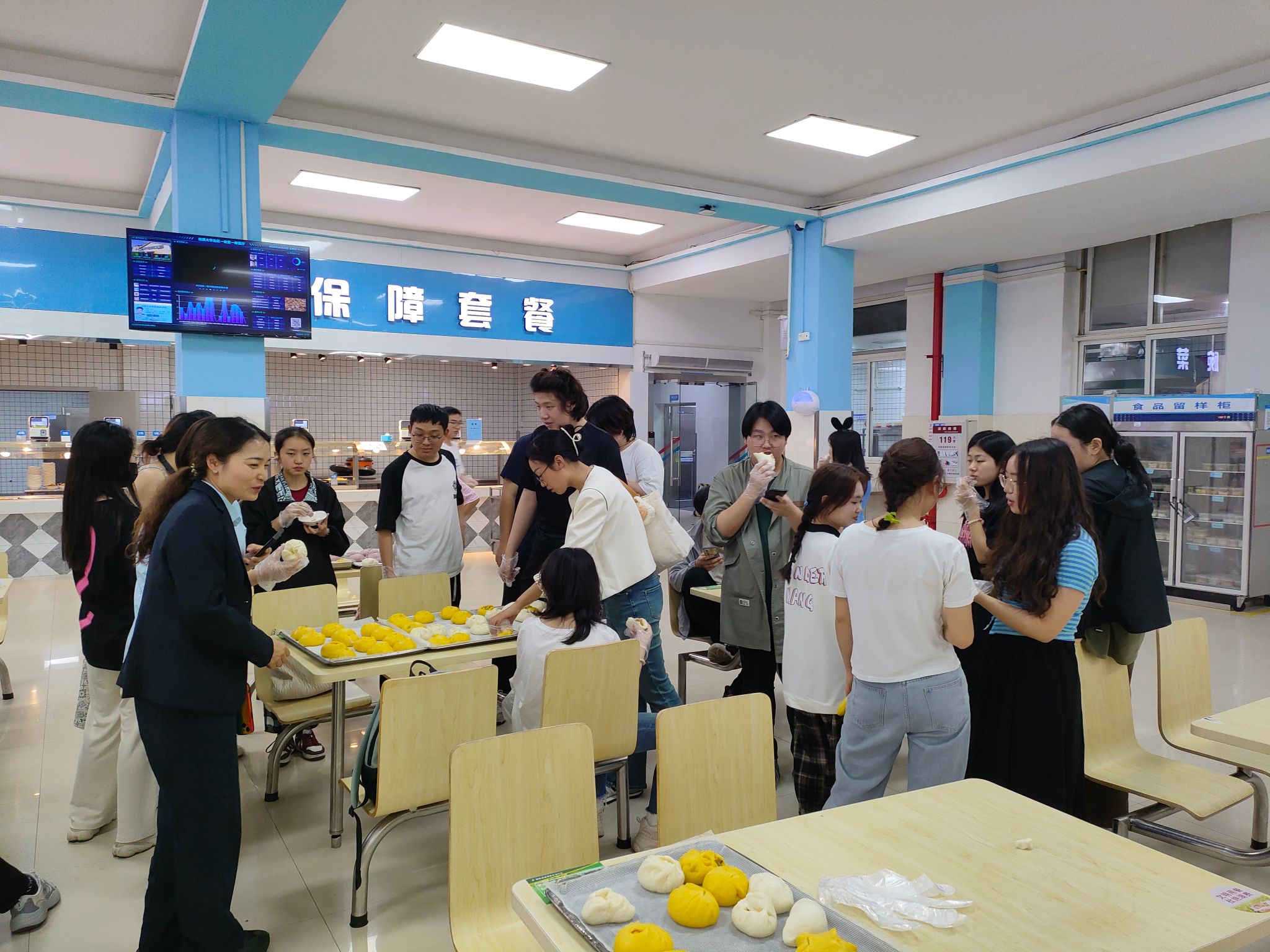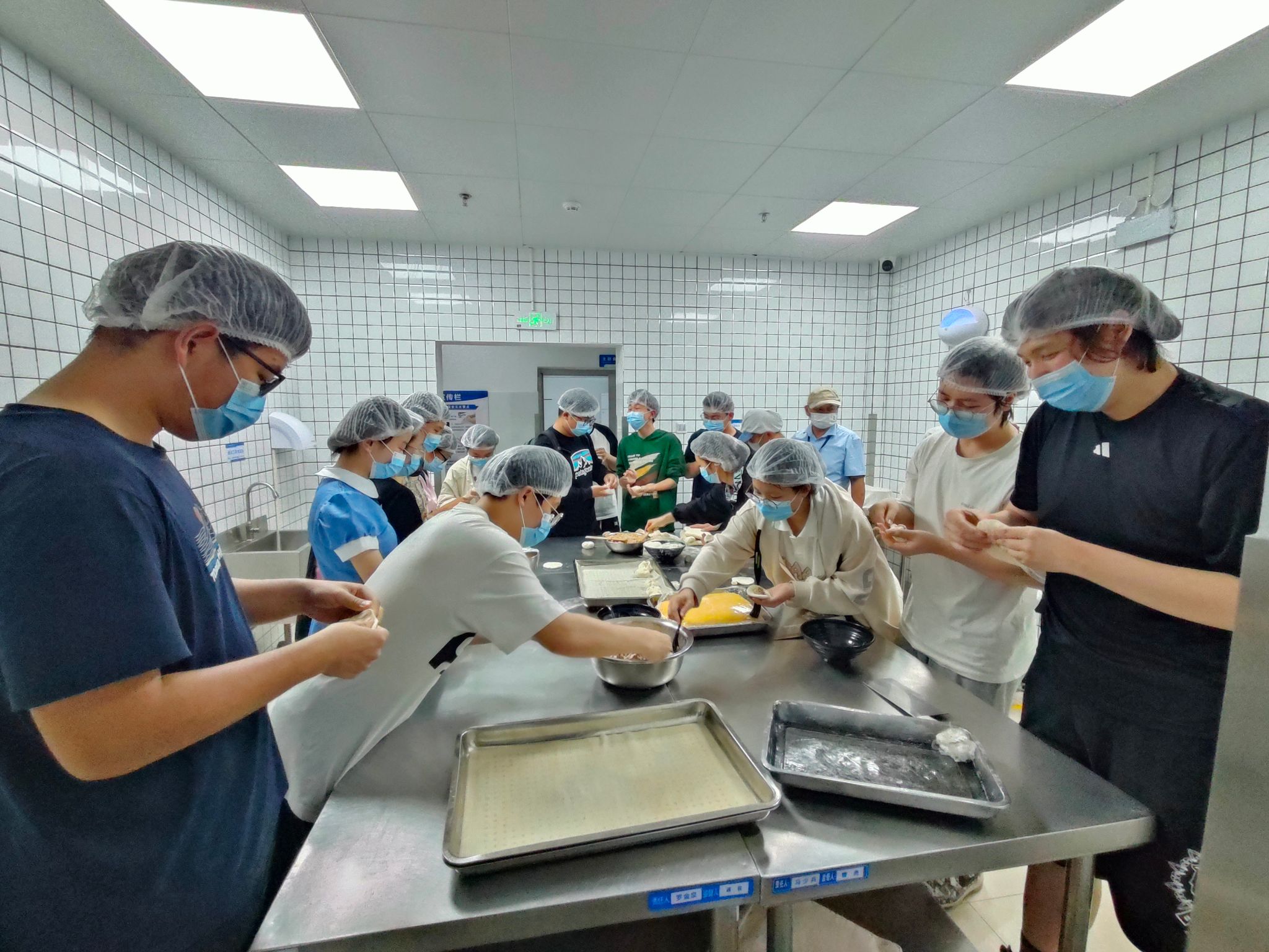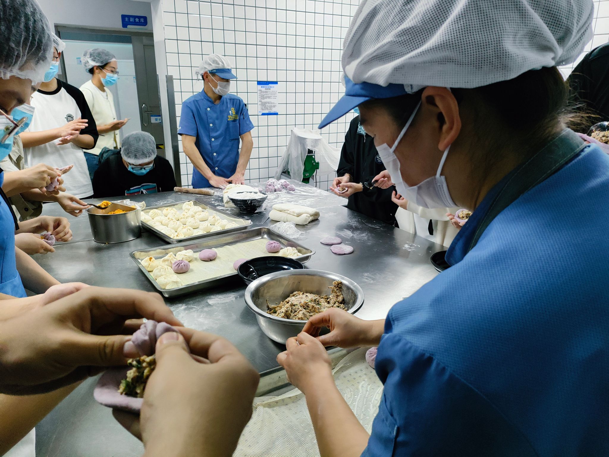 交流讨论结束,洗净双手后,大家一起前往北区食堂操作间,开展面点制作现场教学。面点师傅向员工们展示了面点的制作过程,并邀请辅导员滕笑丽老师以及员工们动手尝试。同学们热情地卷起袖子,投入到了面点制作之中。他们的动作熟练而充满个性——擀面皮、填馅料、捏造型……每一道工序都充满了欢声笑语。经过大家的共同努力,餐盘上摆满了形状各异、色彩斑斓的包子,不仅承载着饮食服务中心对同学们深深的关怀,更是装满了同学们的欢乐与满足,让人心中涌动着温馨的感动。