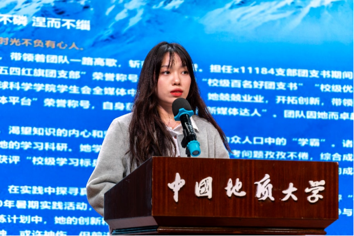 黄晴6次参与野外实践,两获“优秀实习生”称号。她将荆楚文化与地学专业深度结合,获“三下乡”实践校级一等奖,在珠峰国际论坛上作英文报告。她带领班级与离退休党支部结对共建,助力班级获评“五四红旗团支部标兵”。她以“一万年太久,只争朝夕”的干劲,成为青年扎根专业、兼具家国情怀与集体责任的典范。