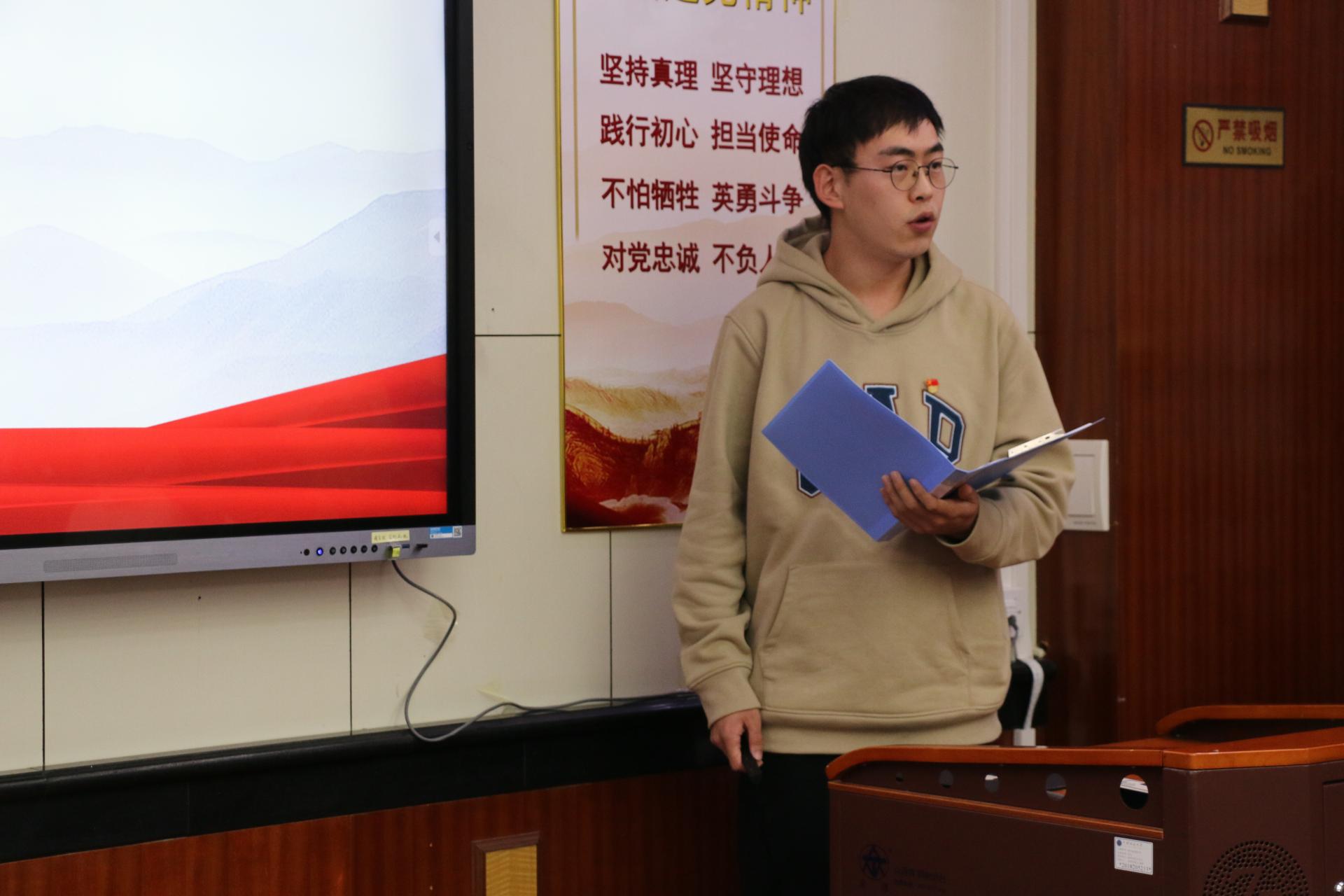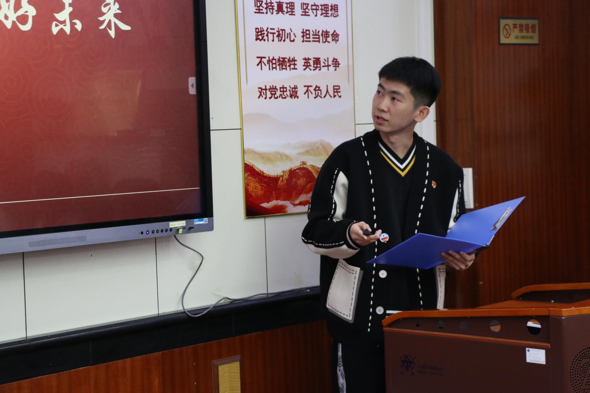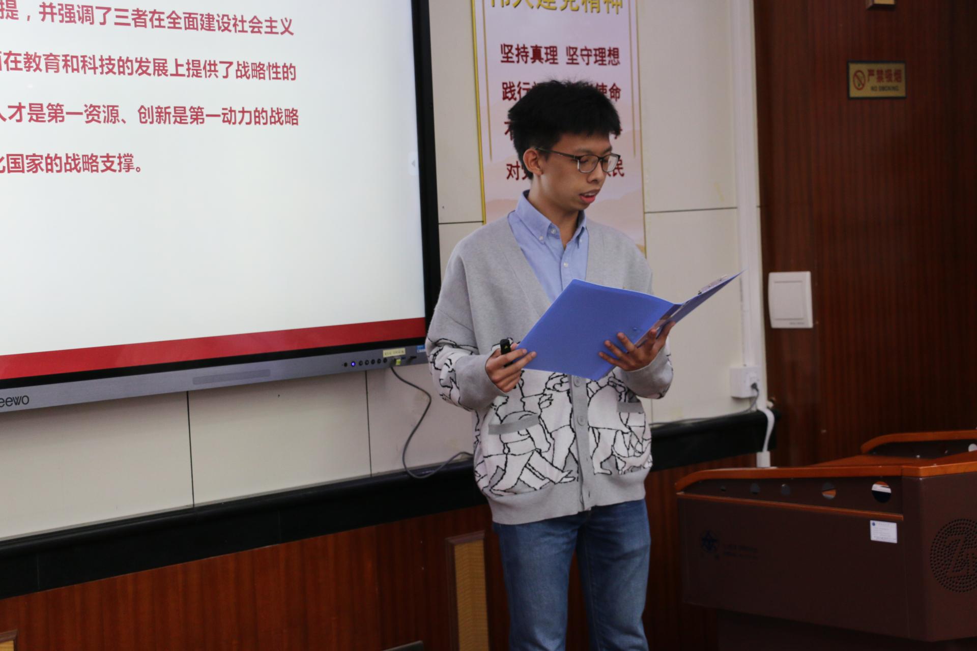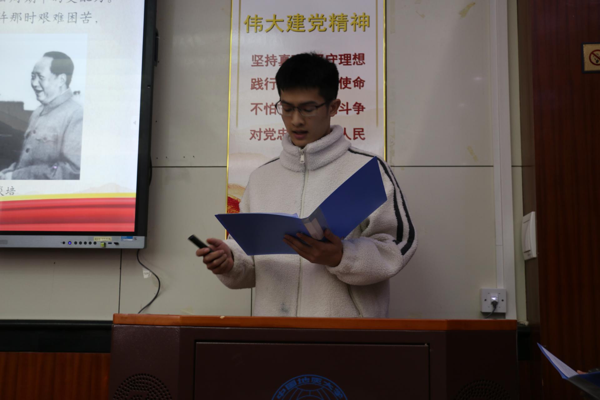 地球深部研究生党支部的杨鑫茂以《在历史中回望,从新时代出发》为题,围绕党的过去五年和新时代十年伟大变革的重大意义,以小窥大,从自身家乡发展引入,生动展现了祖国十年间发生的翻天覆地的变化,回顾了在祖国发展各个阶段做出突出贡献的青年典型人物事迹,并对站在新的历史起点的新时代青年提出了号召,鼓励广老员工党员勇担时代重任,志存高远,坚定向前。