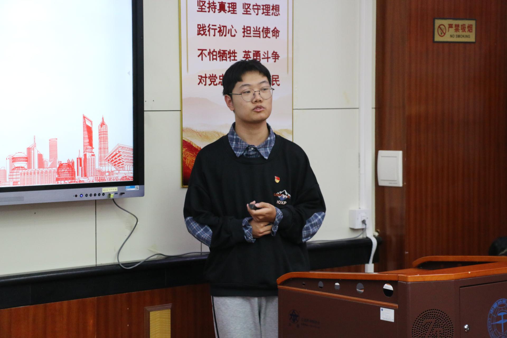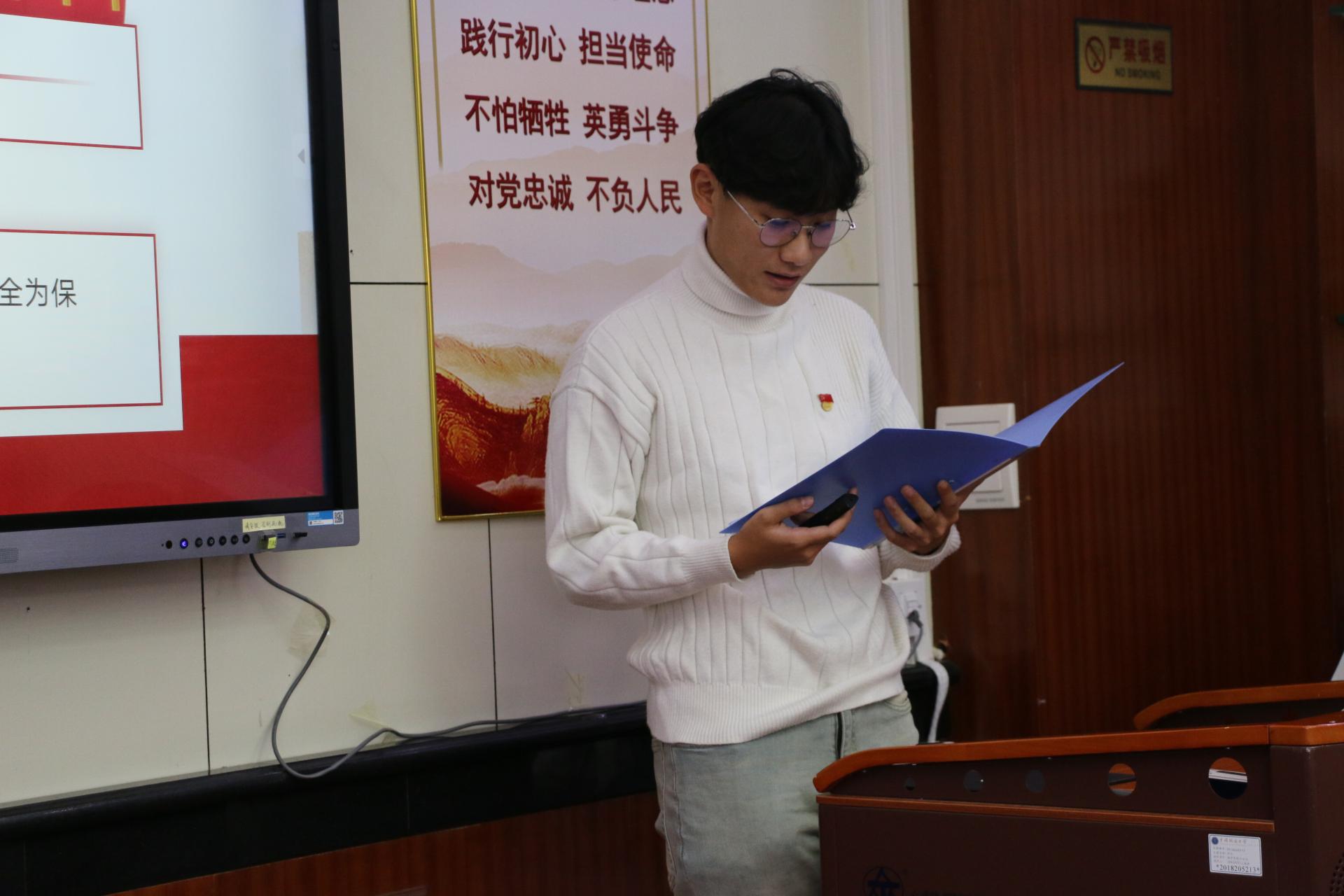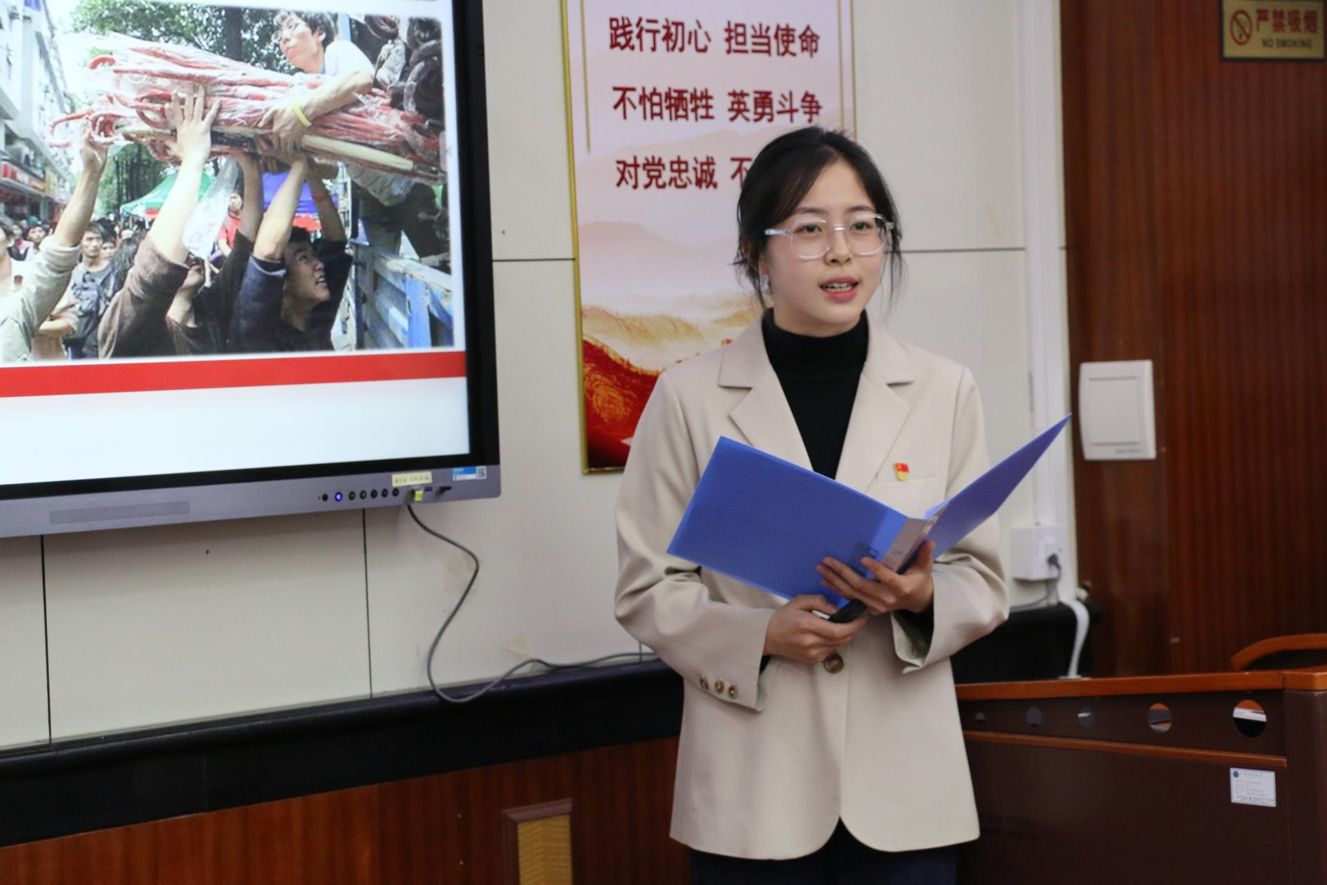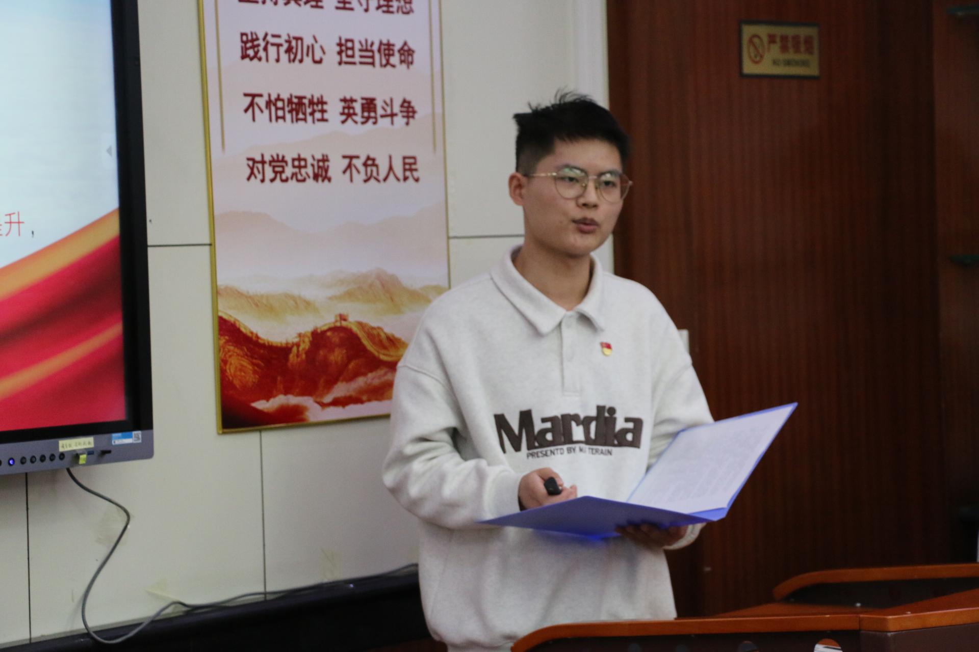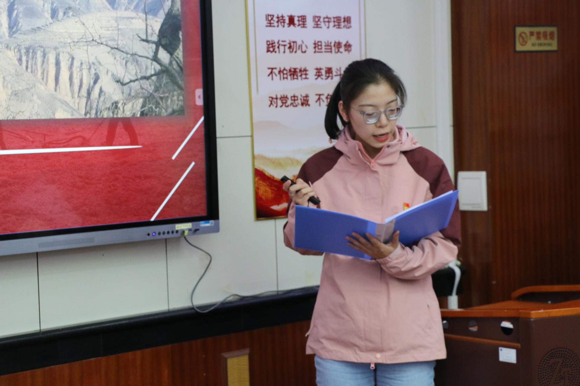 地球深部研究生党支部的杨鑫茂以《在历史中回望,从新时代出发》为题,围绕党的过去五年和新时代十年伟大变革的重大意义,以小窥大,从自身家乡发展引入,生动展现了祖国十年间发生的翻天覆地的变化,回顾了在祖国发展各个阶段做出突出贡献的青年典型人物事迹,并对站在新的历史起点的新时代青年提出了号召,鼓励广老员工党员勇担时代重任,志存高远,坚定向前。