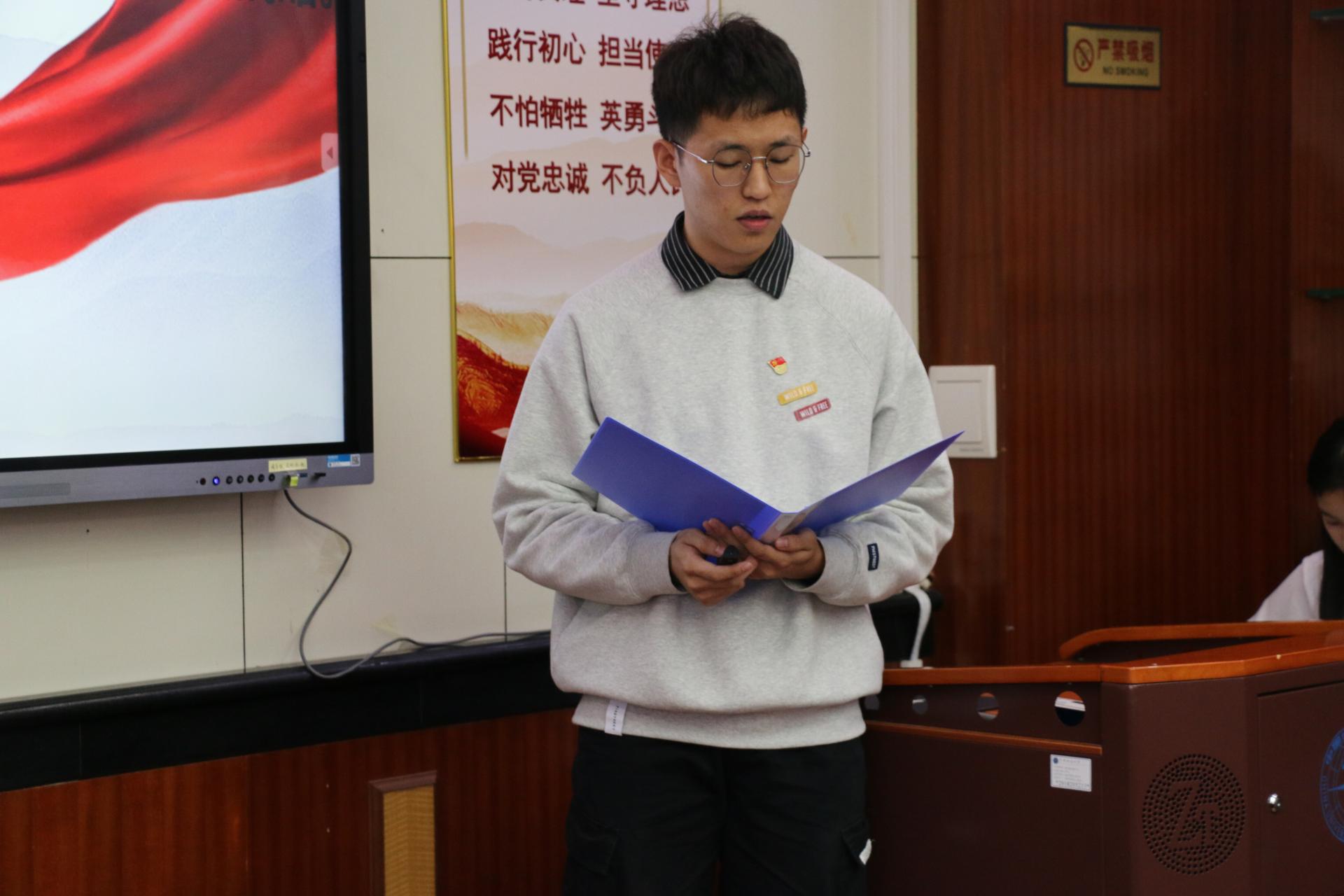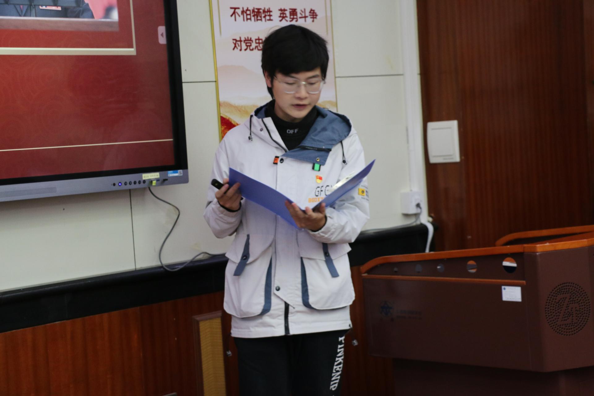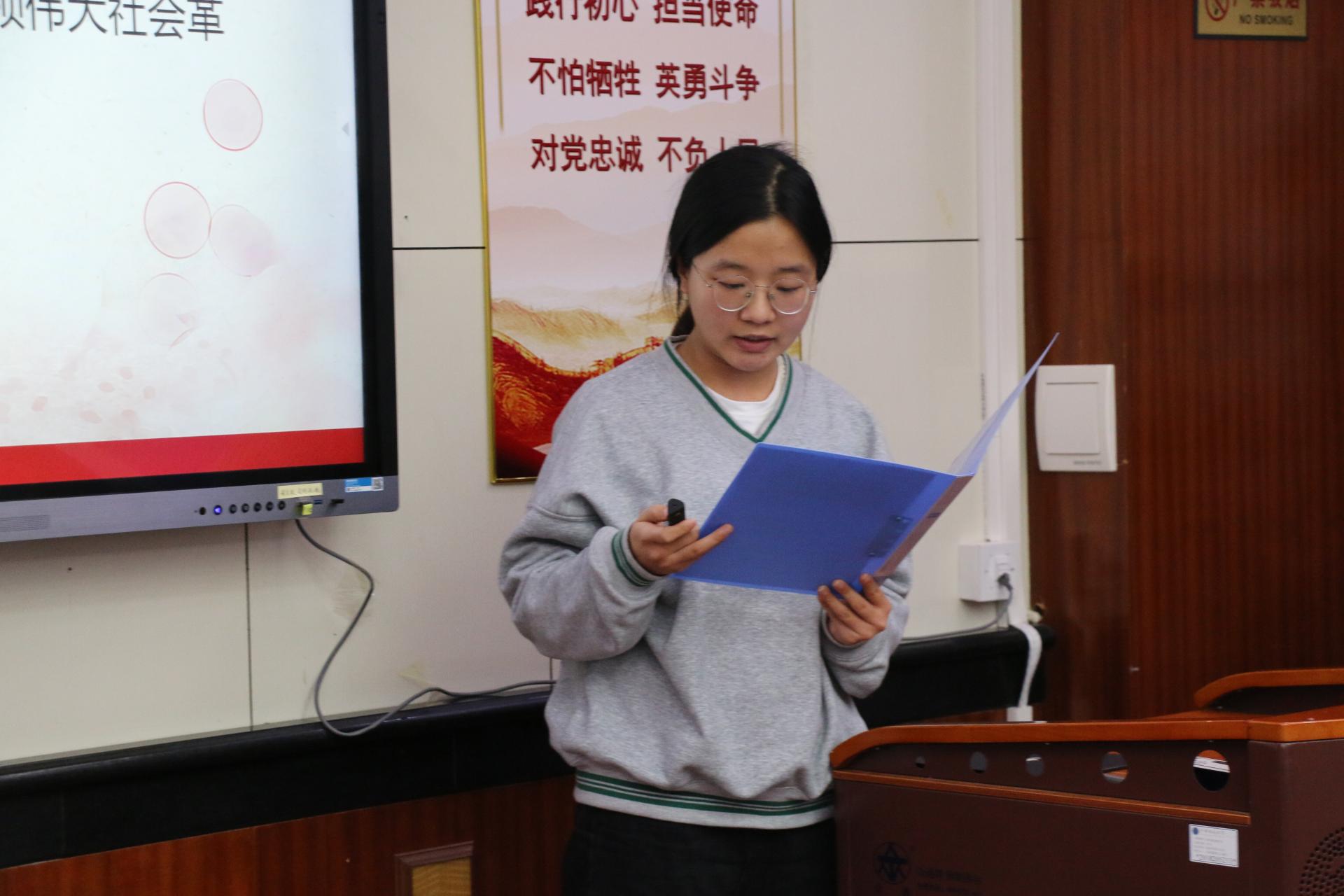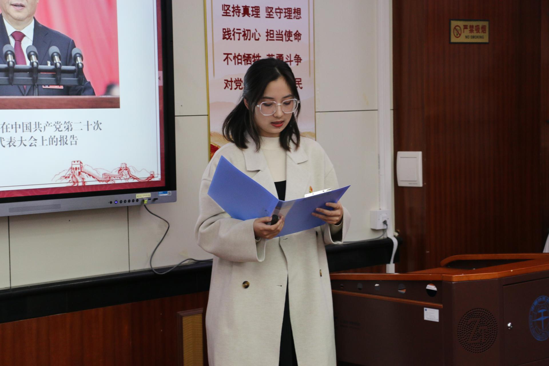 地球深部研究生党支部的杨鑫茂以《在历史中回望,从新时代出发》为题,围绕党的过去五年和新时代十年伟大变革的重大意义,以小窥大,从自身家乡发展引入,生动展现了祖国十年间发生的翻天覆地的变化,回顾了在祖国发展各个阶段做出突出贡献的青年典型人物事迹,并对站在新的历史起点的新时代青年提出了号召,鼓励广老员工党员勇担时代重任,志存高远,坚定向前。