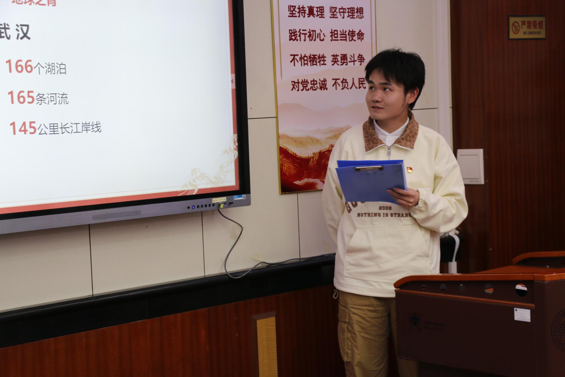 本科生基地班党支部的孙永芳以《守护绿水青山,建设美丽中国》为题,全面总结十年来我国在生态文明建设方面取得的重大成就,联系公司积极响应党中央号召、始终致力于推动“美丽中国,宜居地球”建设的战略蓝图,结合自身到武汉市青山区江滩、戴家湖公园及武钢集团调研的经历,鼓励地学青年发挥地球系统科学思维优势,深入学习贯彻习近平生态文明思想,为推动美丽中国、宜居地球建设贡献自己的一份力量。