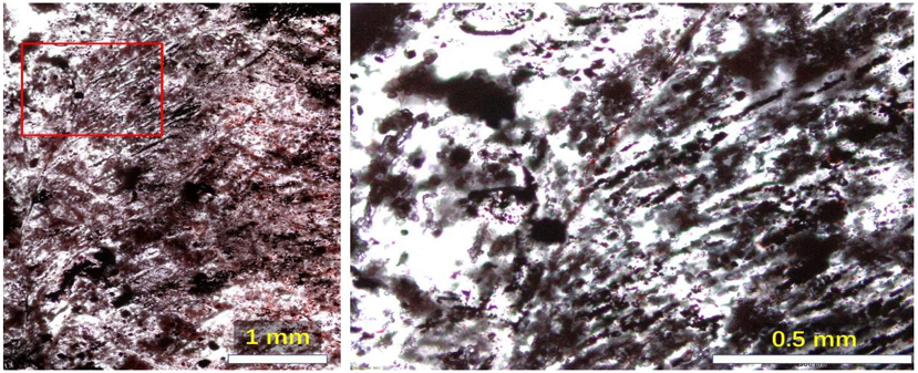The research team sliced the rock into sections about as thick as paper (100 microns) in order to closely observe the tiny fossil-like structures, which are made of haematite, a form of iron oxide or rust, and encased in quartz. These slices of rock, cut with a diamond-encrusted saw, were more than twice as thick as earlier sections the researchers had cut, allowing the team to see larger haematite structures in them.